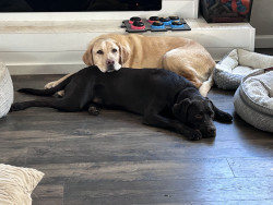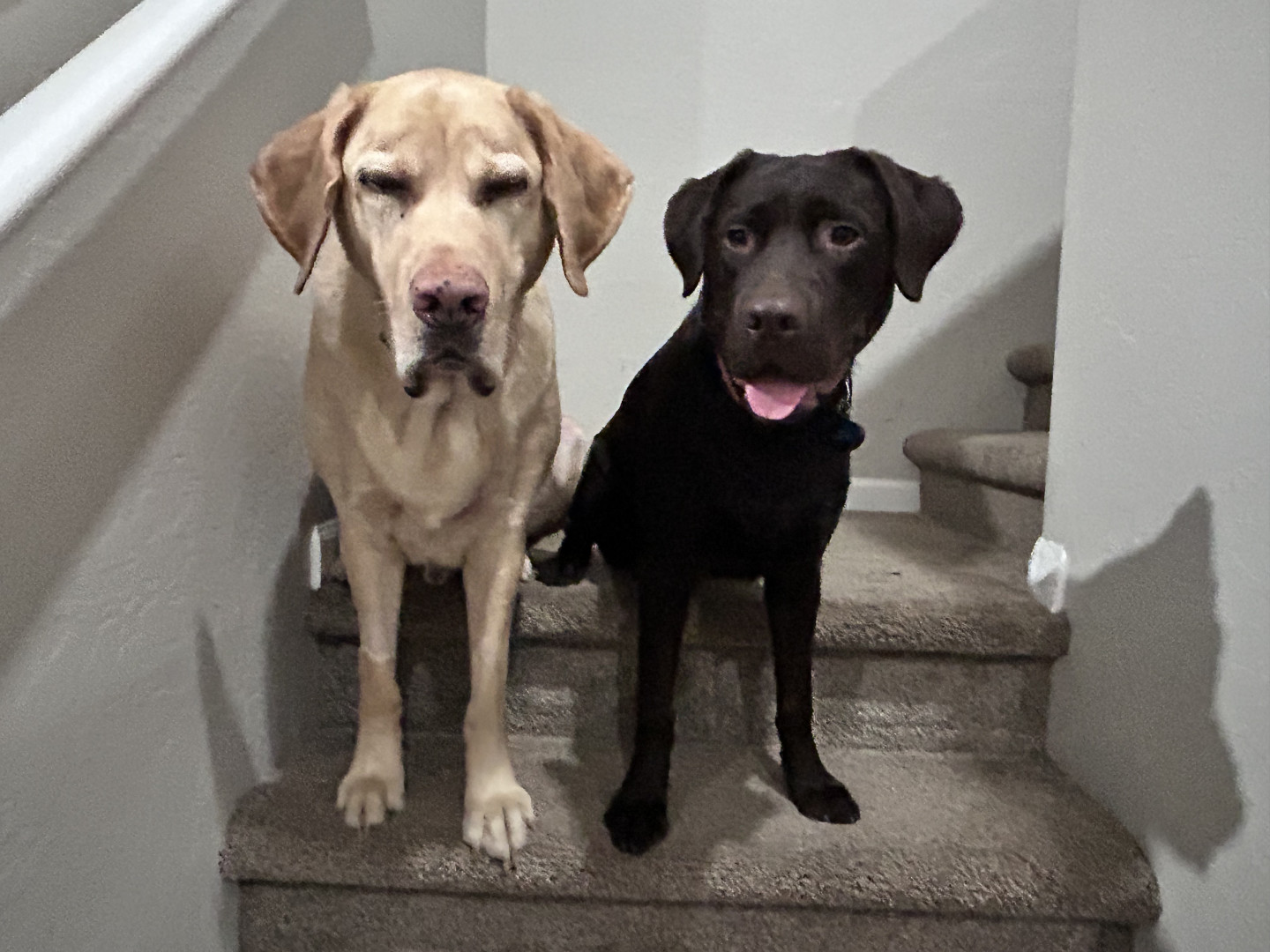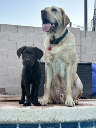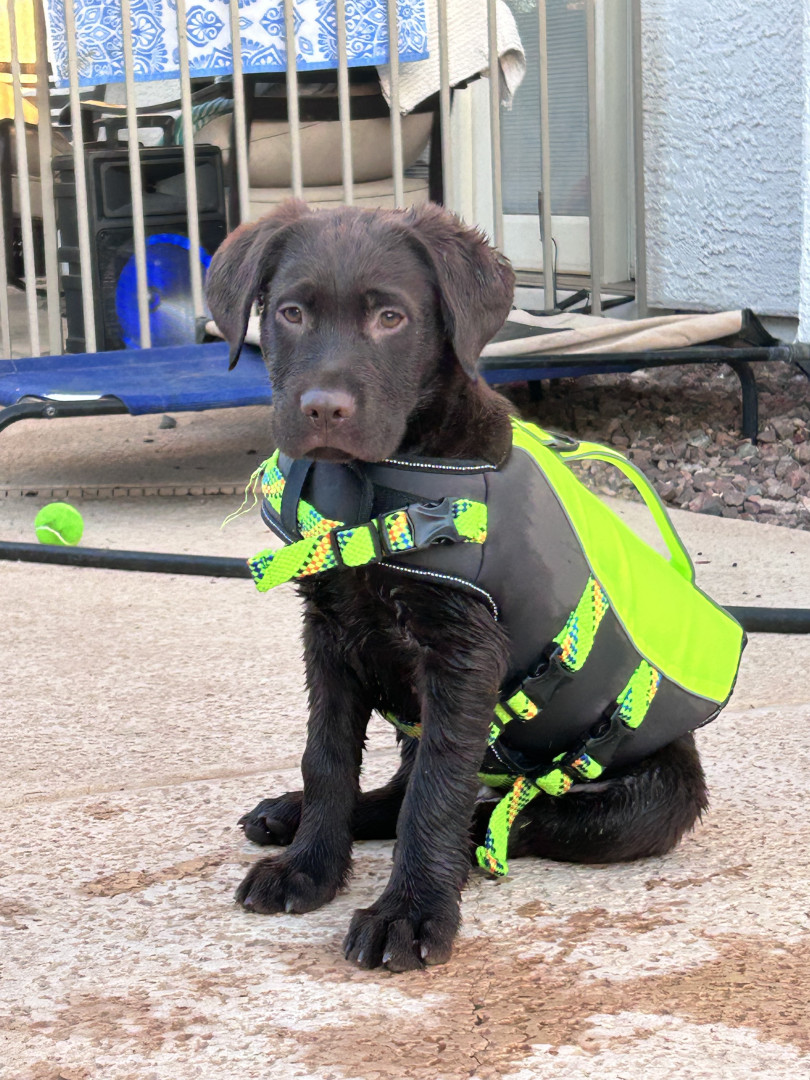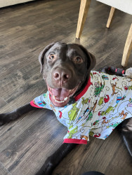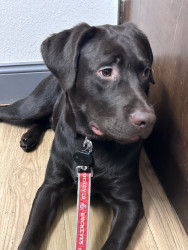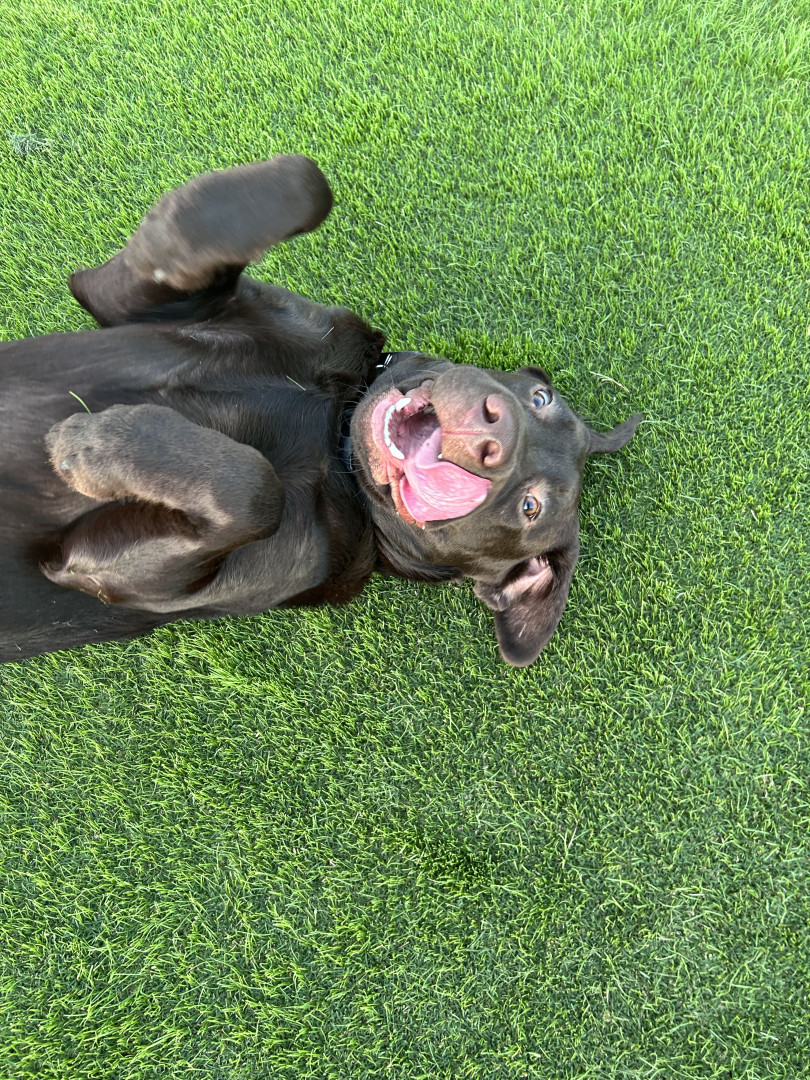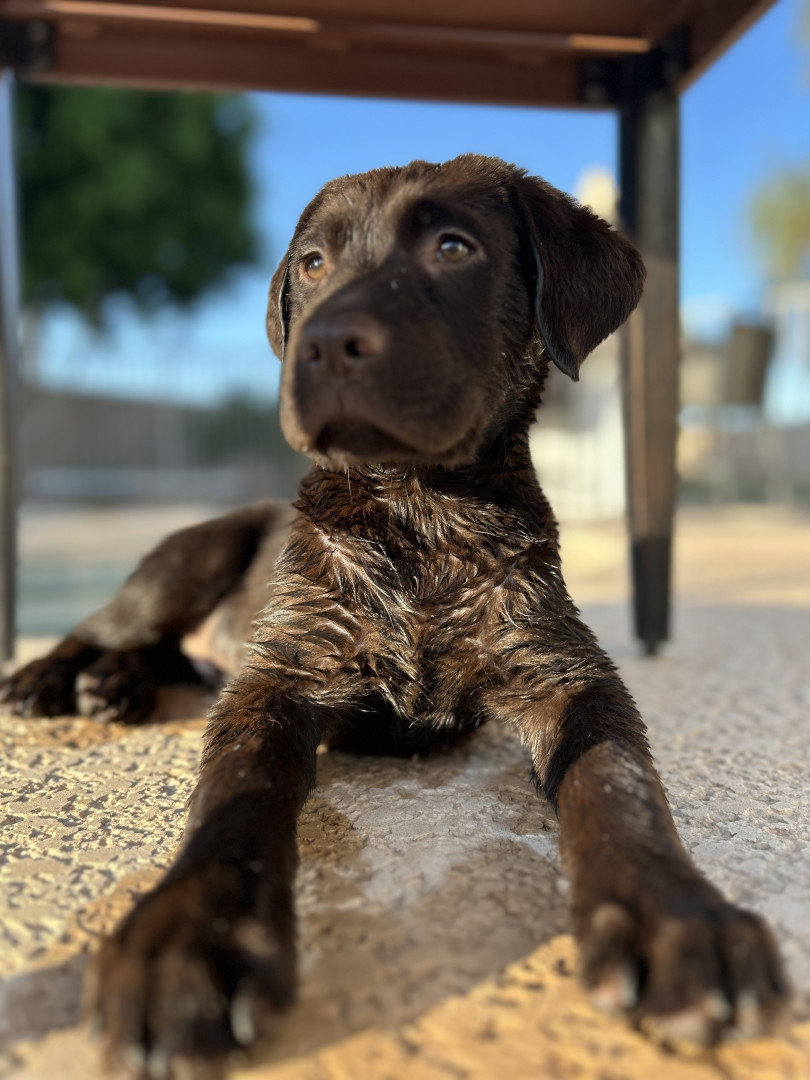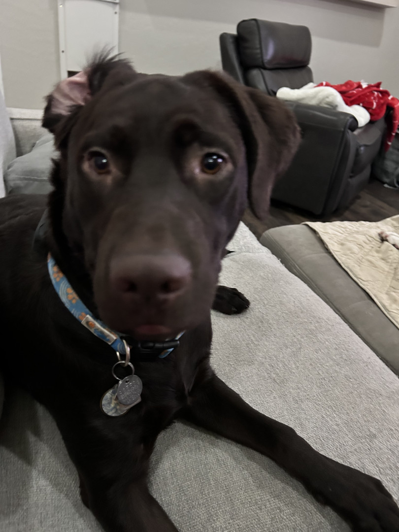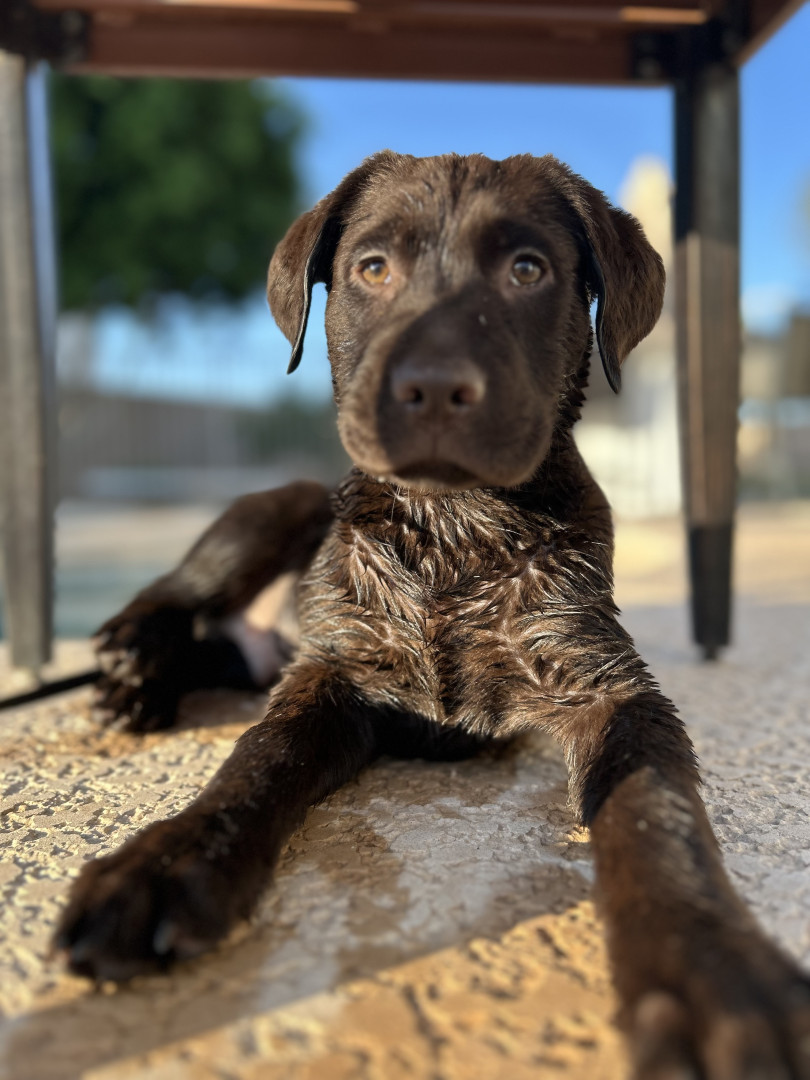 Fearless chocolate lab - bold heart, full of mischief and attitude, barking back with a goofy grin and endless adventurous energy.