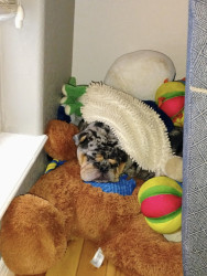 Bernie is a sweet, laid-back girl with a beautiful soul, finding her happiest moments curled up for naps on her big teddy bear.