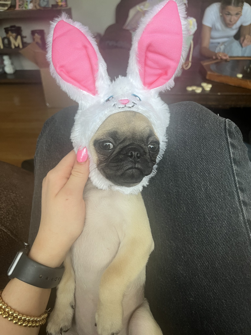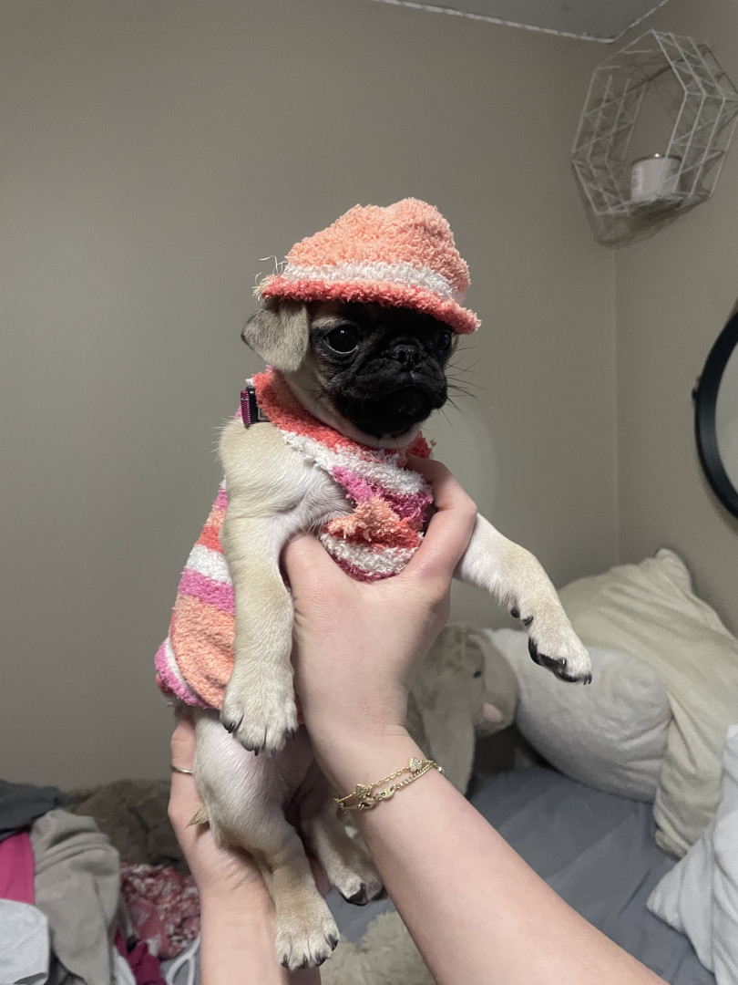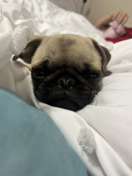 Bibble is a quirky lil pug.She loves snacks and trying to eat non edible items around the house. Shes a tiny girl for pug size,but loves big