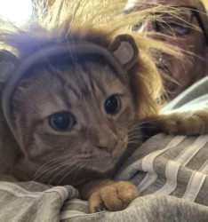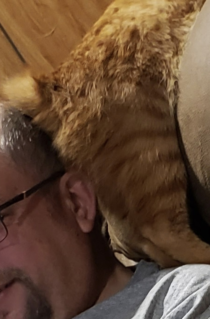He has a bunny tail or as we like to call it his "puff" ๐ธ he is the softest cat this side of the Mississippi ๐บ will give you his ornery open-mouthed side eye one minute and the next minute he is acting like an innocent baby ๐ถ he likes to sit on his daddy's head or stick his puff in his daddy's ear ๐ธ