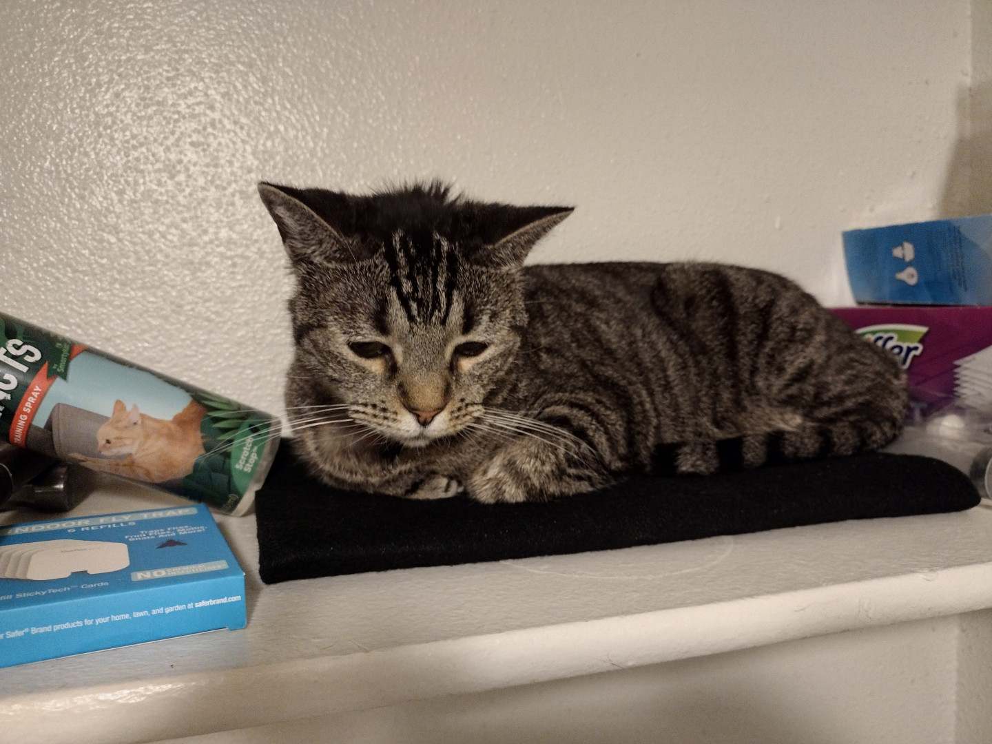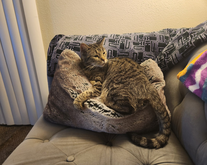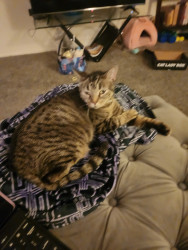 Bilbo is a rescue cat who was traumatized by her previous adopters. She was abandoned in an empty apartment with water only, no litter box or food. She was returned to rescue where she came to be fostered by me. It took her several weeks to trust me, but now she is so happy. I love being her Mommy.