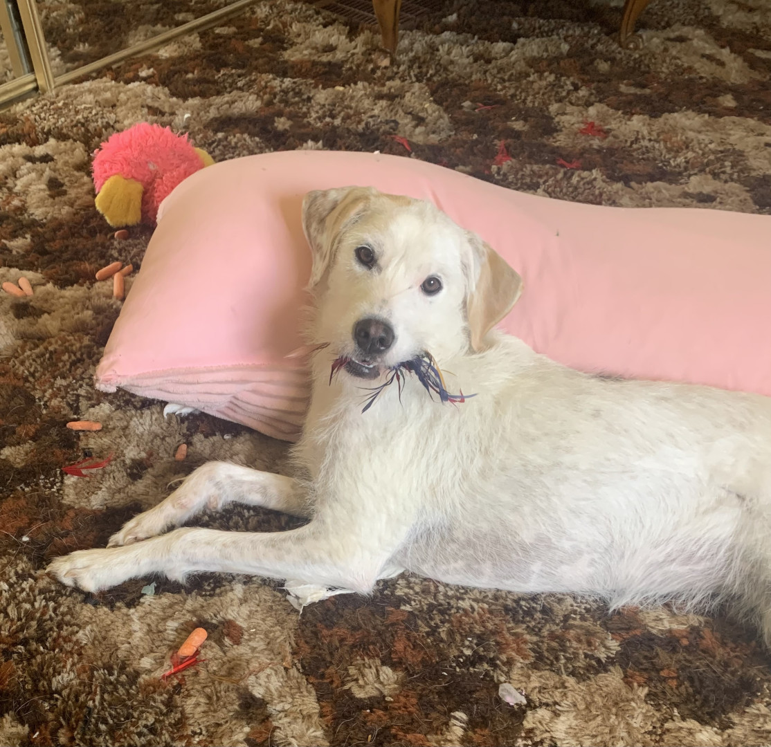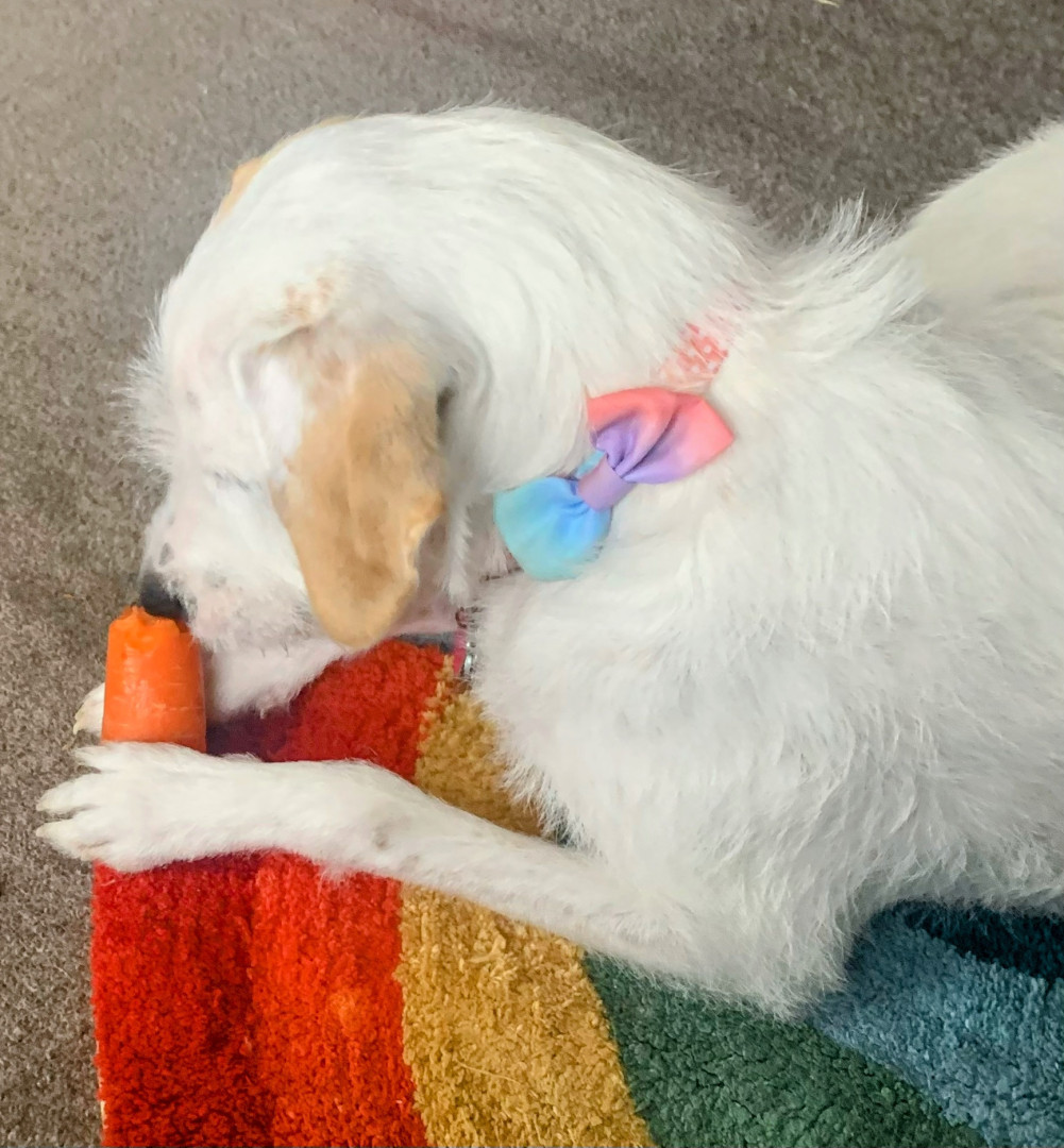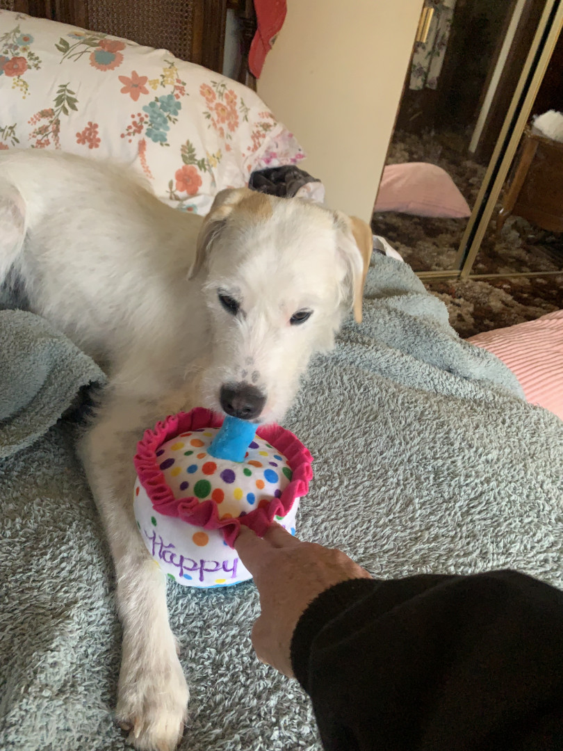 Toy: Red terry cloth Cookie Monster that is so ungodly LOUD!! Treat: Chicken Jerky- she eats so much I’m surprised she doesn’t have feathers instead of fur😂