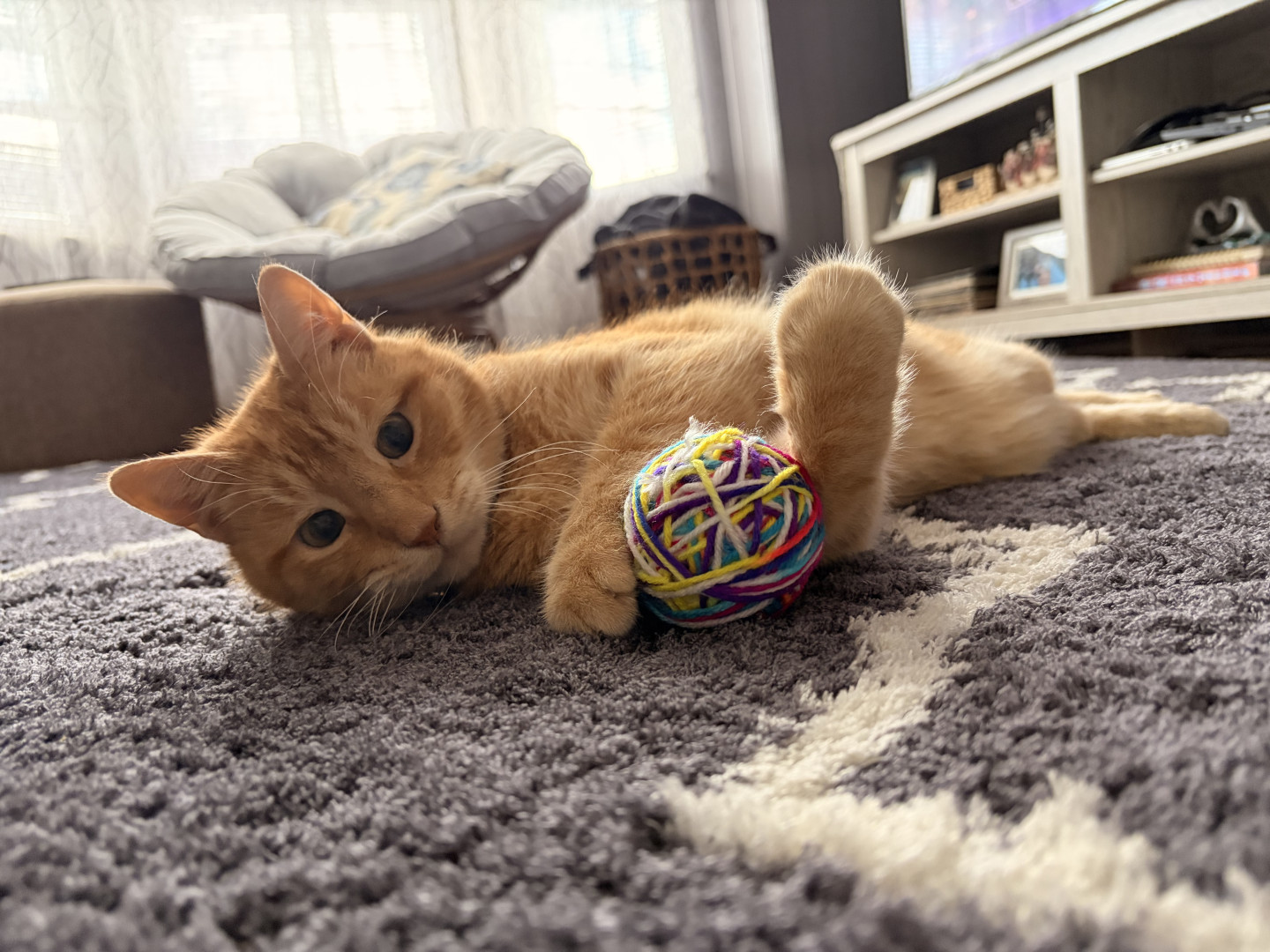 Bizzi's favorite toy is a tiny mouse he treats as a soccer ball when he's not chasing around a paper target bag.