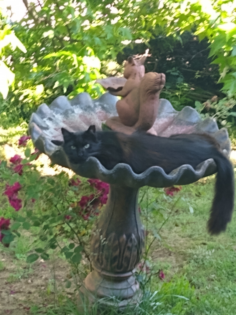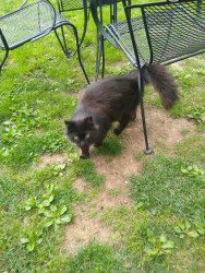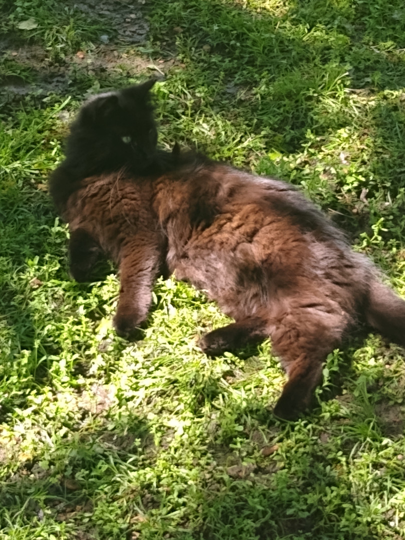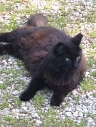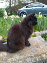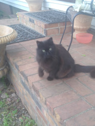 He is a beautiful fluffy Mane coon who loves to sit on your lap. He loves his pictures taken and has pretty green eyes. He greets me daily!