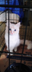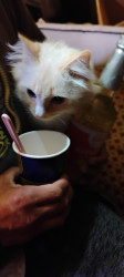 Black is a beautiful white cat with a little bit of orange on his face he's so beautiful he loves he loves us to talk to him and he tries to