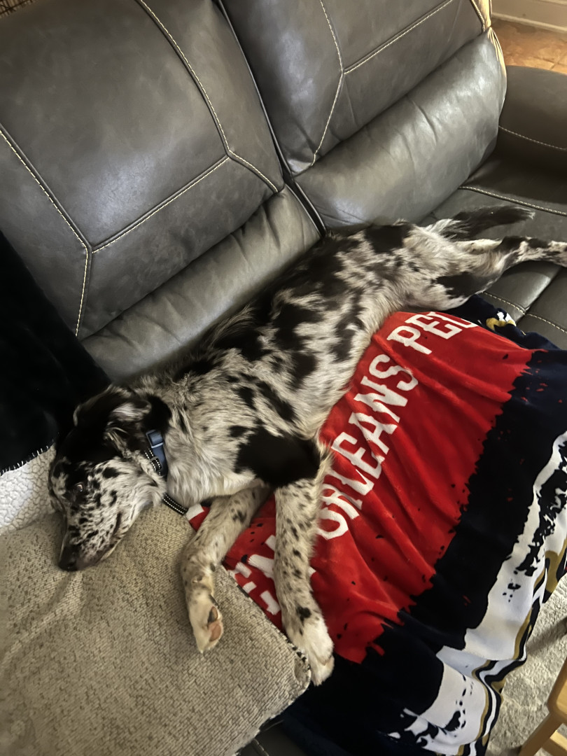 Bleu’s a rescue and very scary with new people but LOVES anytime we bring an animal around. He loves running as all Australian Shepherds do!
