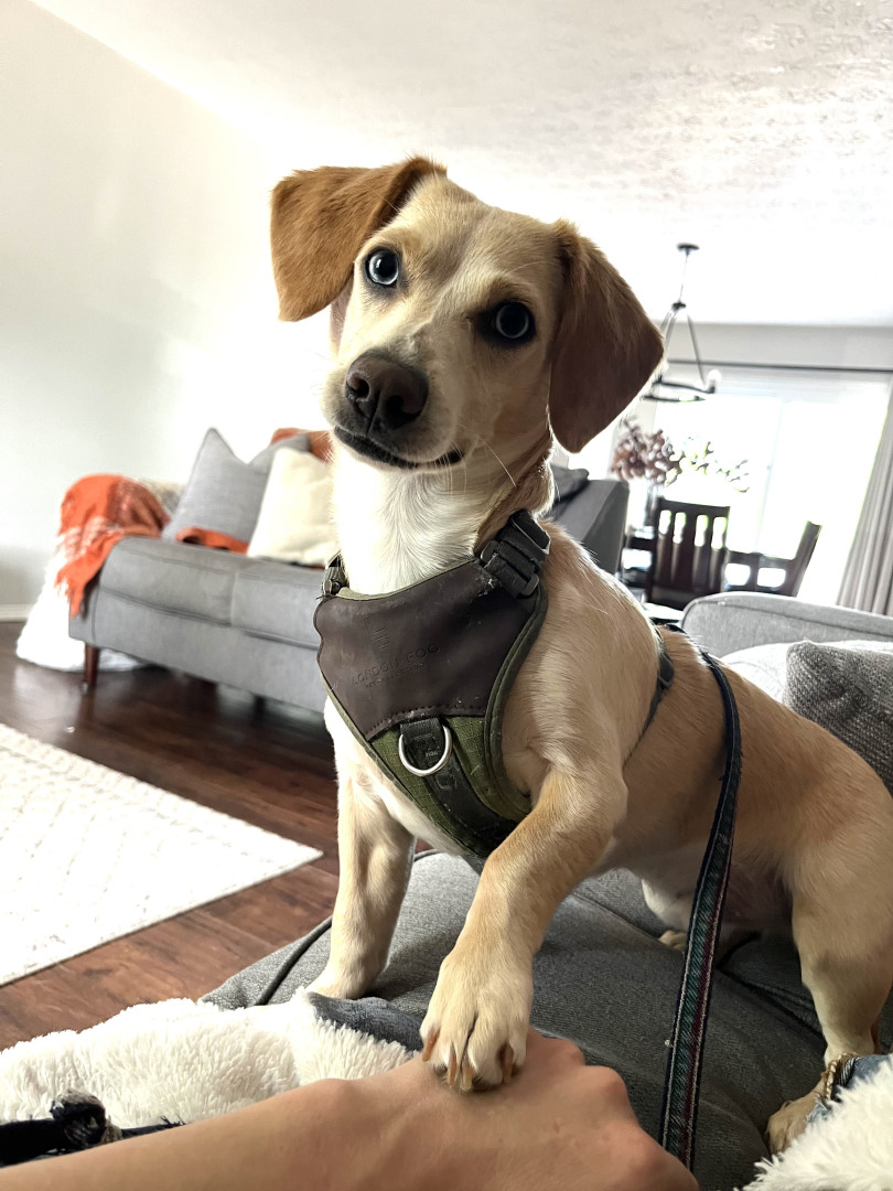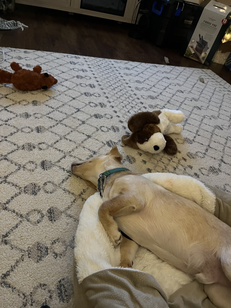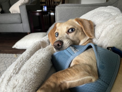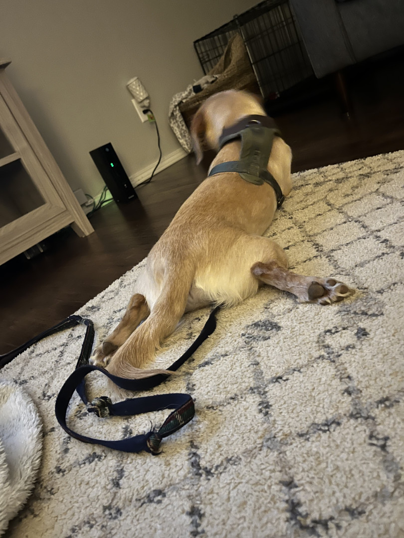 He’s just so quirky. So, I’ll name as many quirks as I can. The first is that he gets so excited to play. He loves a good play session and he growls so loud. He’s not mad he’s just full of happy growls. He also still gets the zoomies every night. He runs wild with his butt tucked, his eyes wide, and his ears back growling as loud as he can. He also had cat behavior, he walks between your legs, leans on your legs, or sits on your feet. When he’s tired, he brings his bed out of his crate:)
