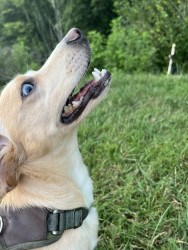 Well, everyone in my neighborhood knows Blu. I live in a retired neighborhood and if someone drives past me walking him, they pull over to say hi to Blu. He has a lot of personality, he’s always happy, and not very obedient which makes him charming and memorable. His best friend is neighbor dog named honey- she is a three legged lab mix and they are the bestest of friends. He has vibrant blue eyes, he’s playful, curious, and has lots of facial expressions. I have lots more pictures and videos!
