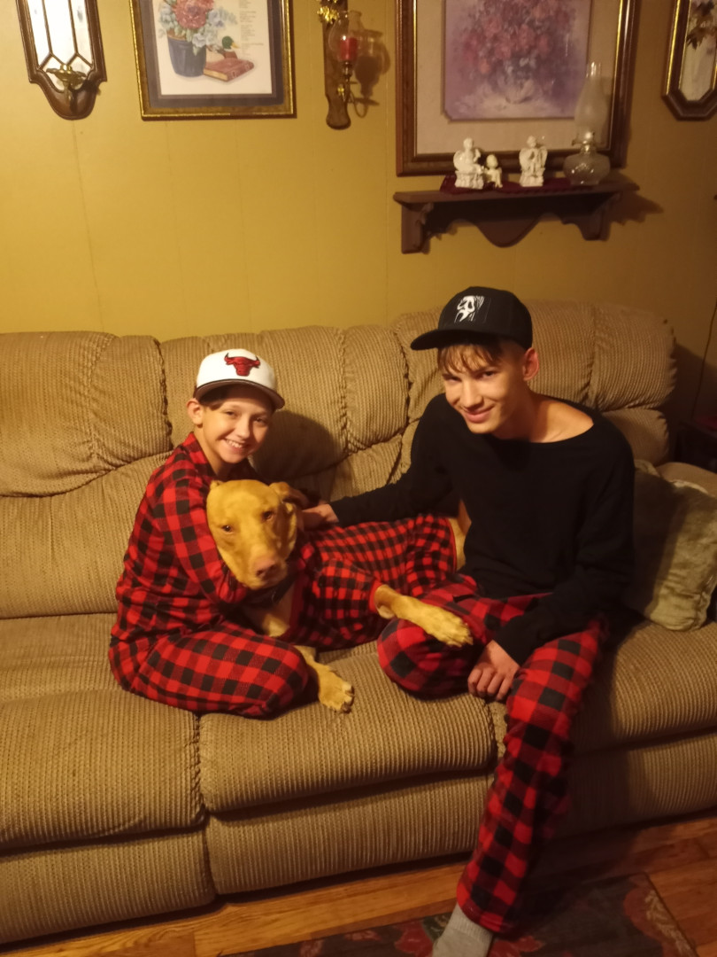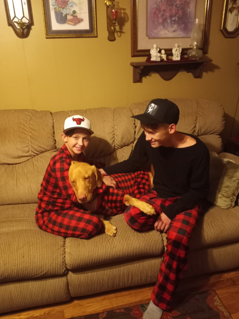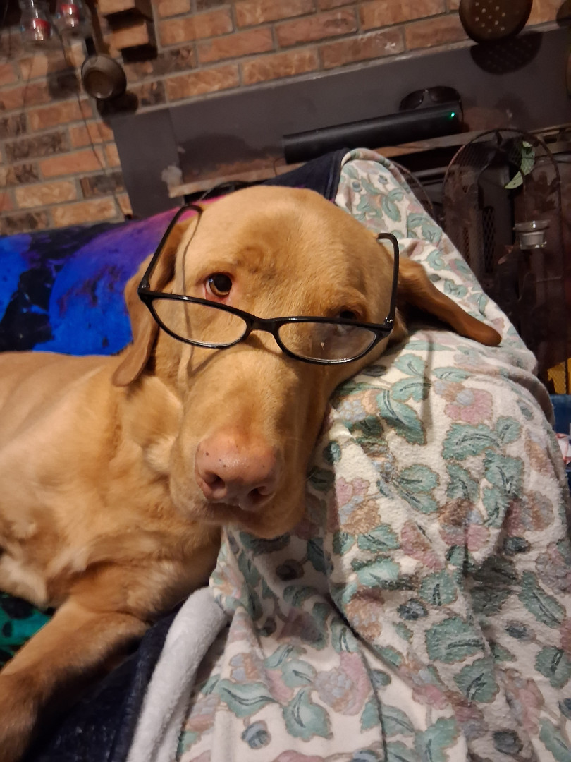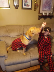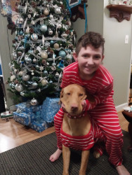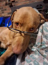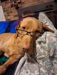 Blue is a red Lab he got his name from being born with blue eyes. He is a loving dog he usley lays in between my wife and I on the couch.