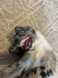 Look wise it’s his eyes, he’s got one bright blue & one brown but if you look at the brown eye it has a flake of the bright blue of the other eye. Personality wise it’s his paws. Bobs favorite way to play is laying on his back tossing toys up in the air & catching them w/ his paws like they are hands, he will also hug you this way & hold his toys like this