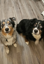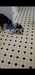 He is very attached to his big brother, when not walking together, he carries a toy or his stuffy ( stuffed animal or chicken) if he doesn't have a toy, he will carry his leash in his mouth.