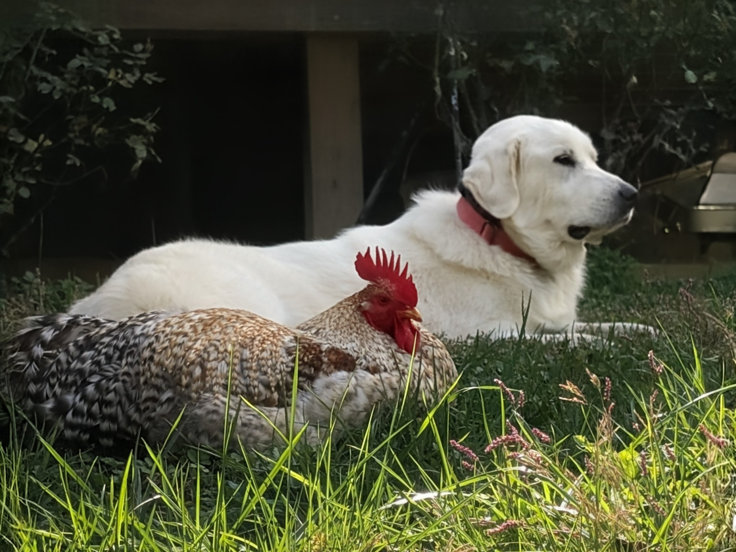 Bonnie, a Great Pyrenees–Anatolian cross, rests while guarding her flock. Seaux stays close, trusting the calm strength beside him.