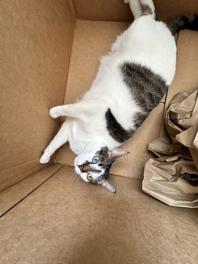 Boo is a 6 YO tabby with strong opinions and (selective) sweetness. She taps people for attention, loves boxes, TV, and food.