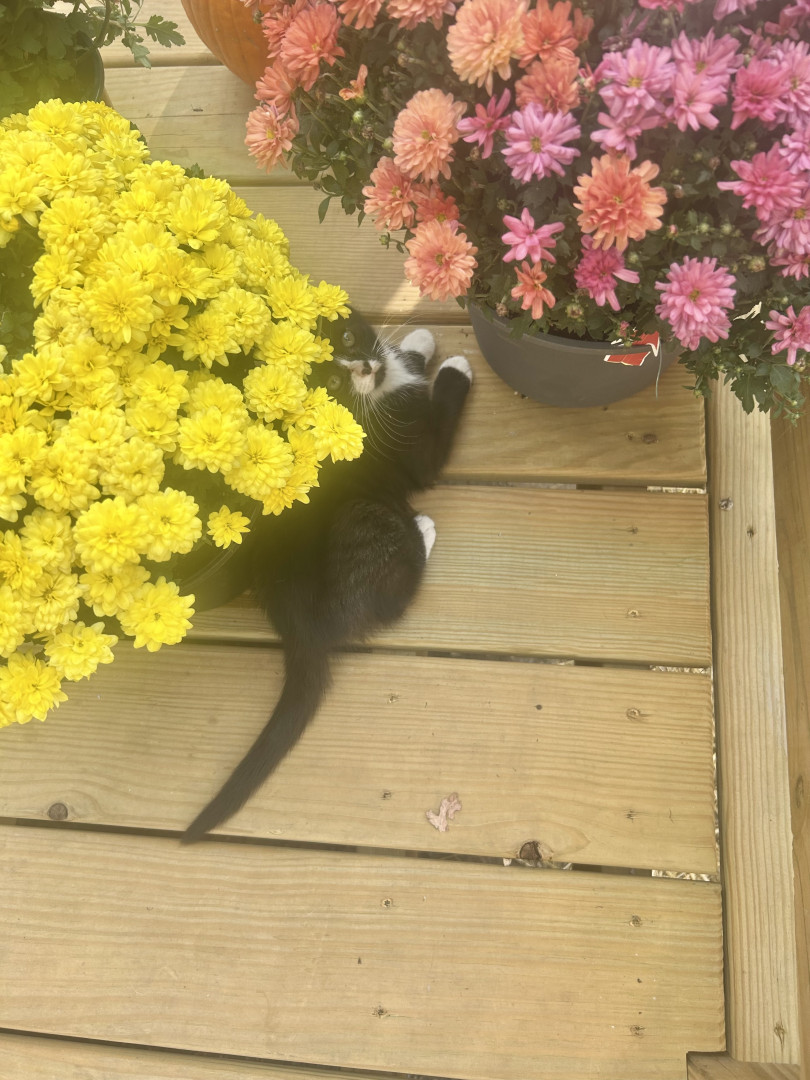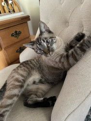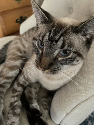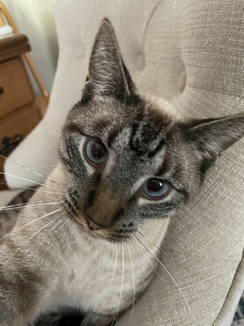 Boo likes lots of attention! He likes to use his blue eyes to get what he wants! He’s also a poly dactyl. He’s also very demanding,l