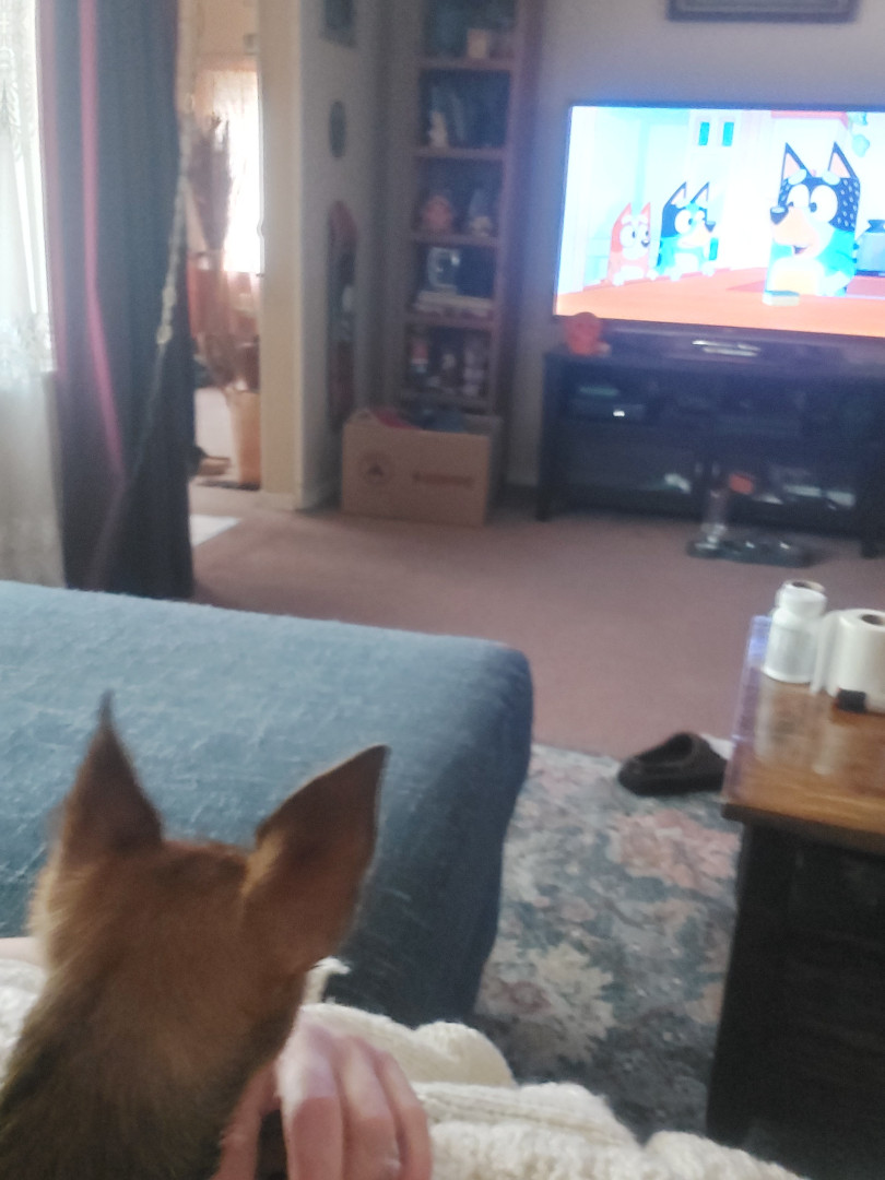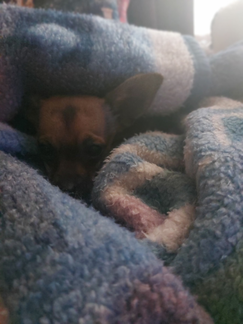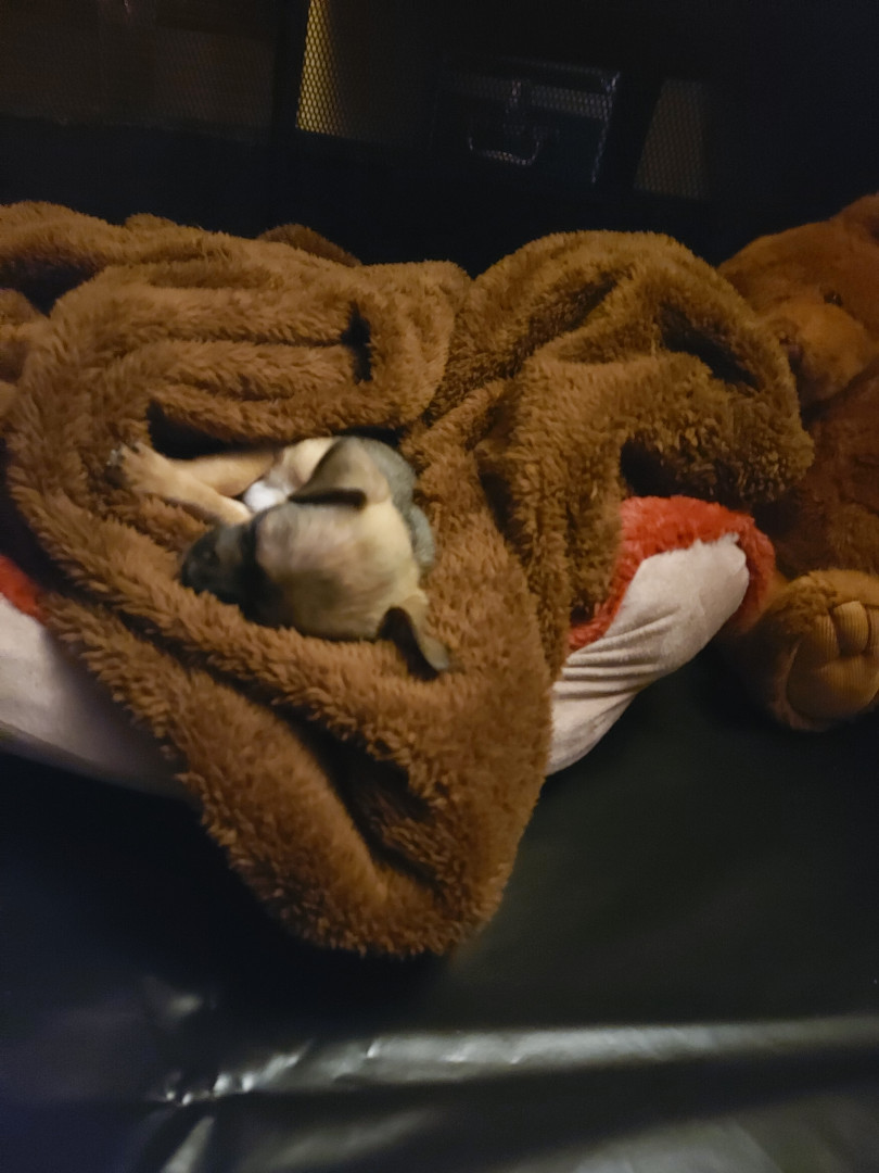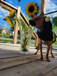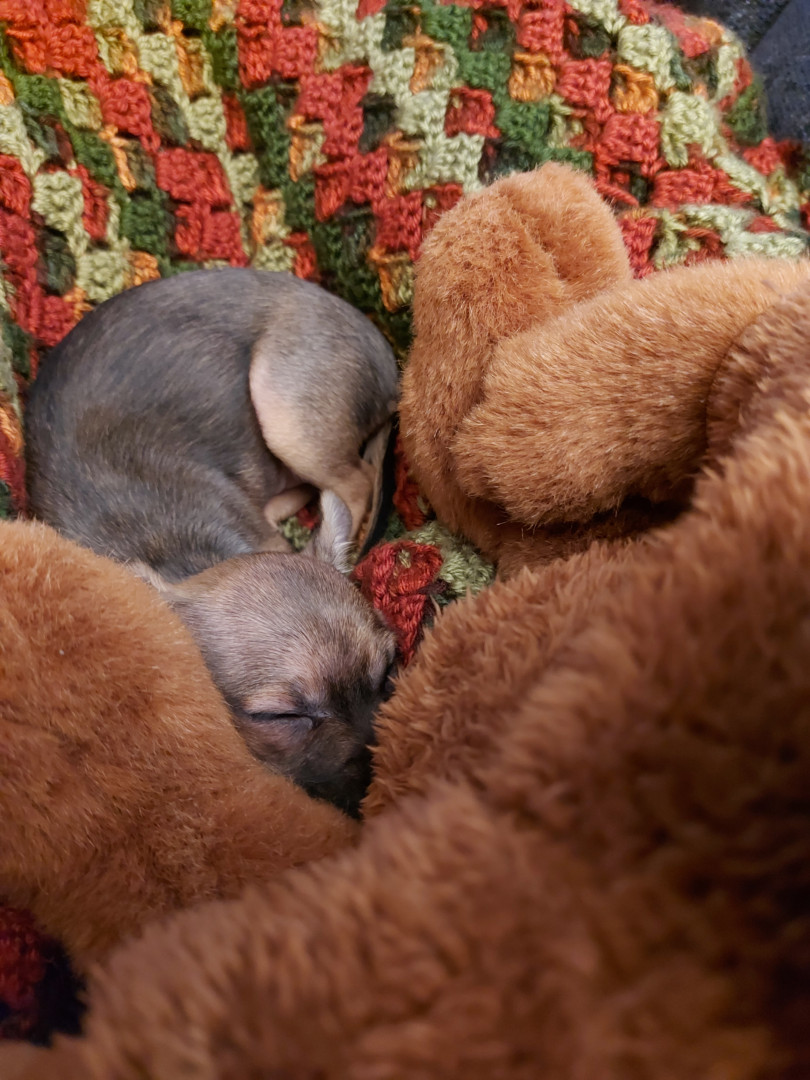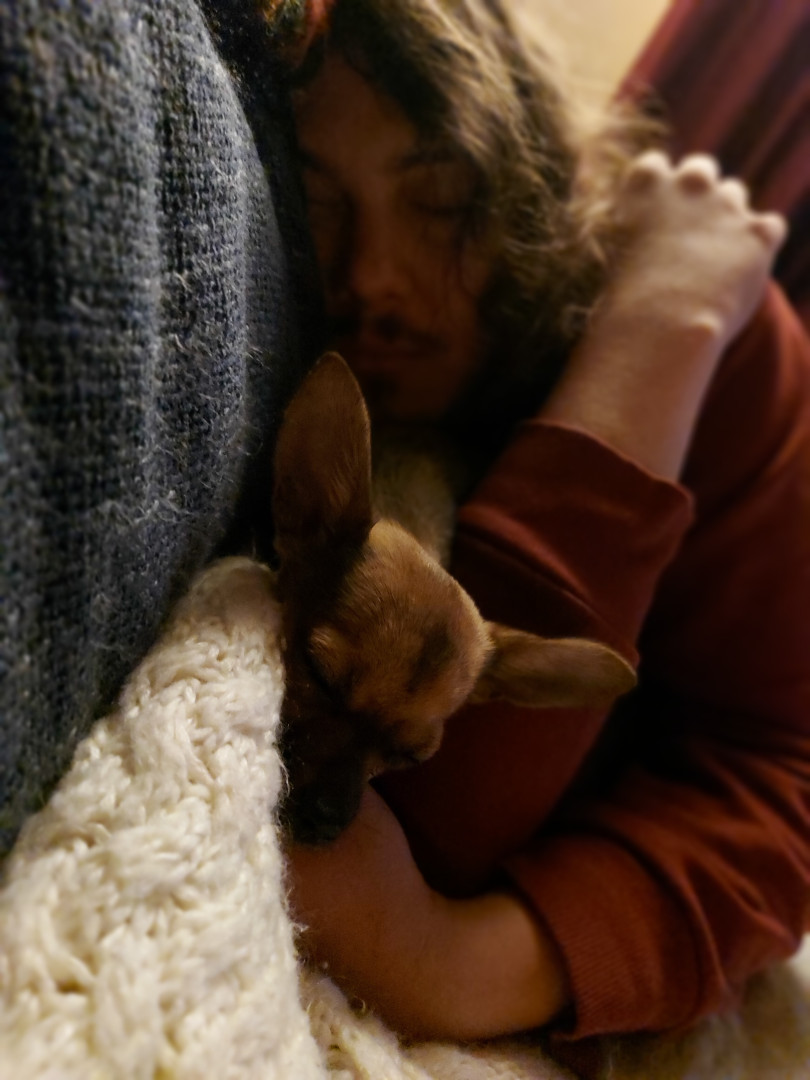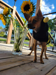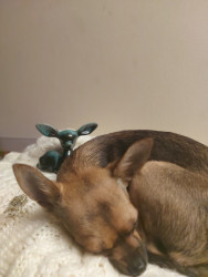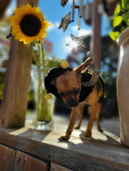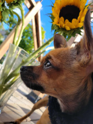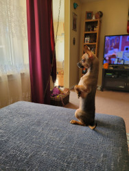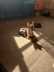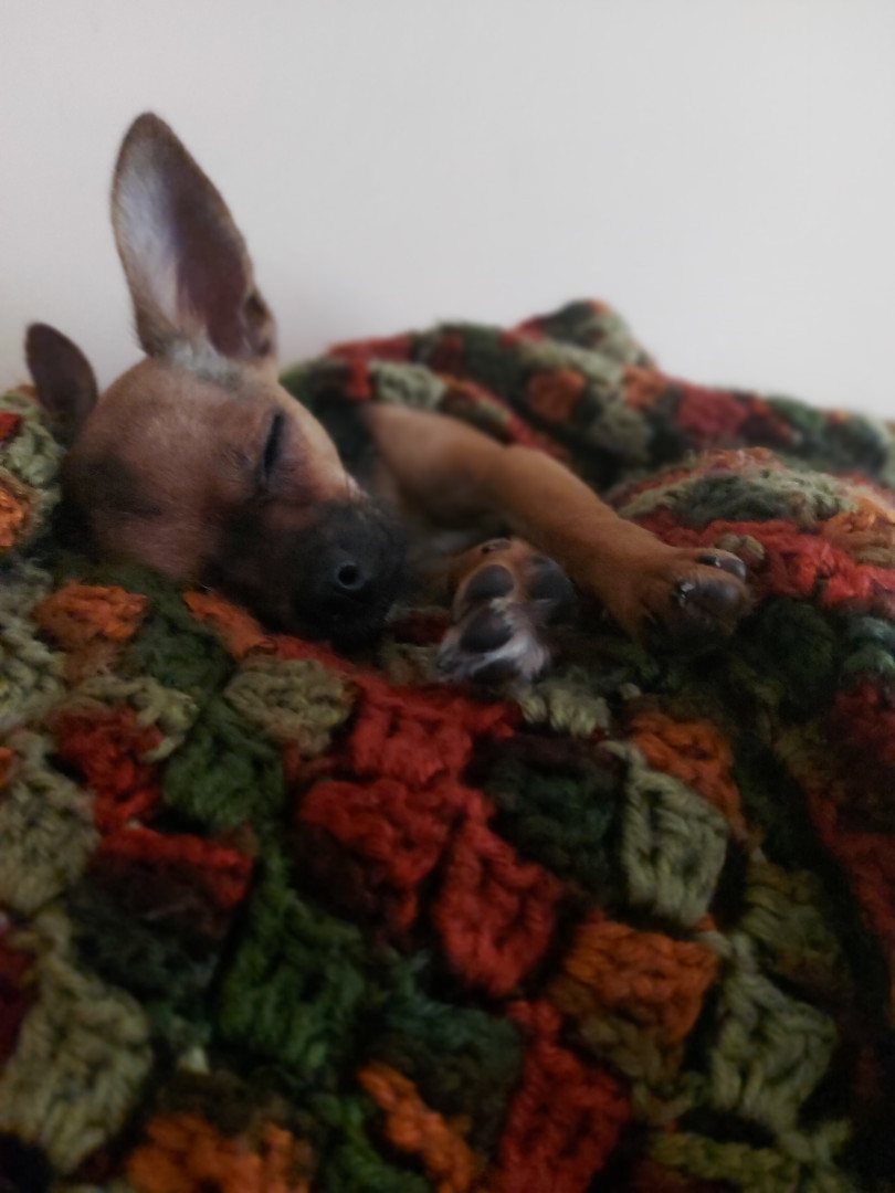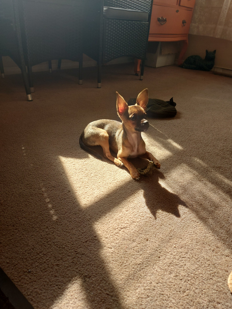 Boone’s most unique quality is a mix of physical charm and quirky personality: she has the delicate, almost magical look of a baby fawn, with "Ariana Grande" level expressive eyebrows that practically tell a story all on their own.. On top of that, she has this hilarious, endearing habit of pretending her back legs don’t work, dragging herself “army style” across the floor especially when she’s excited or causing mayhem--turning even ordinary moments into a full-on performance.
