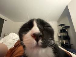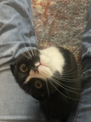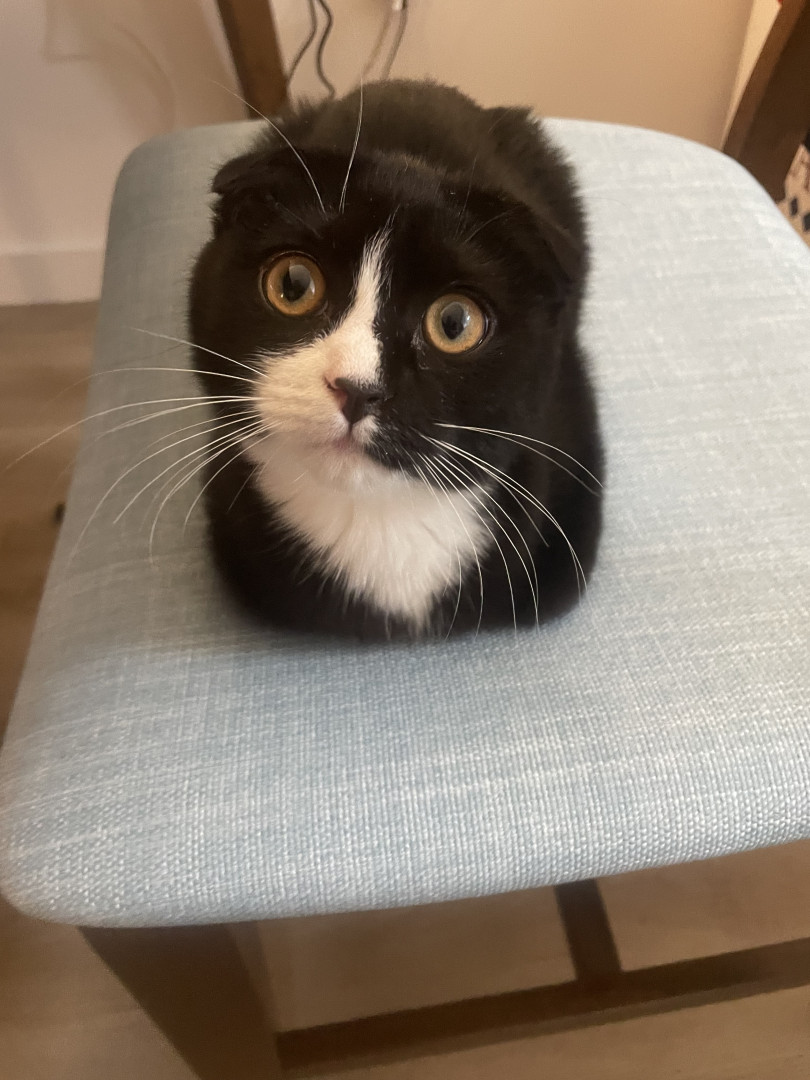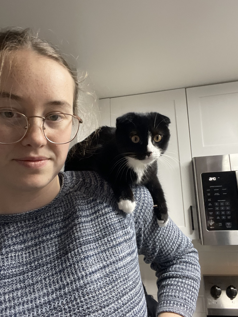 Physically, her ears! She is part scottish fold. Personality wise, she has a really fun raspy meow, and she loves to play!
