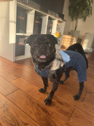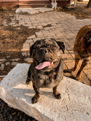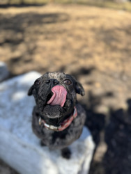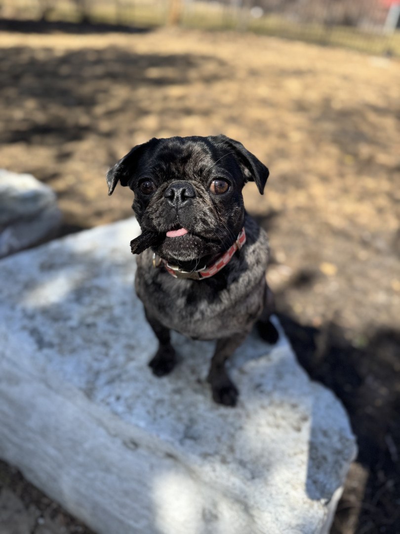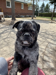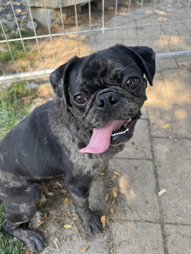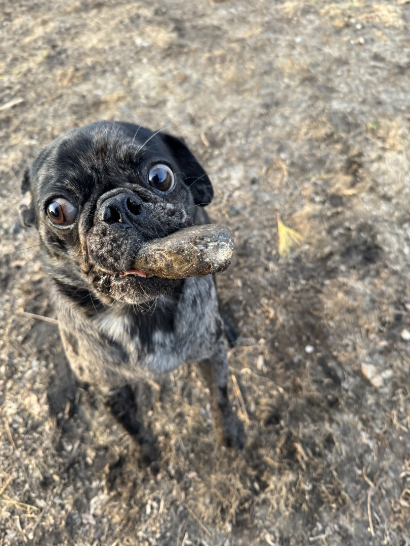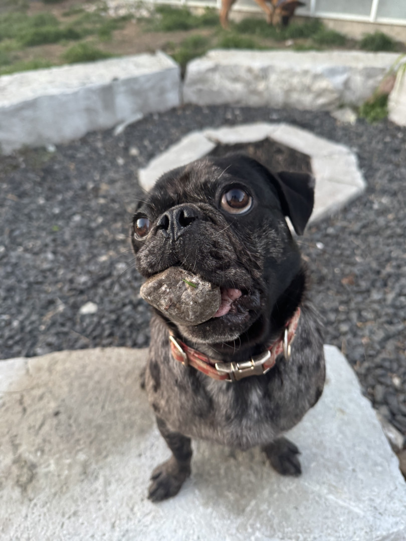 Merle pug with a rock-of-the-day obsession—raised by Malinois, built like a tank, powered by chaos, and always on the move 🐾💥