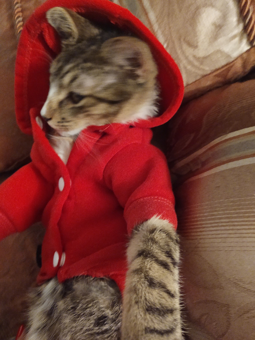 She was from the shelter. Very sweet.her k9 teeth were broken by her owners so she can not defend her self.She is a inside cat.