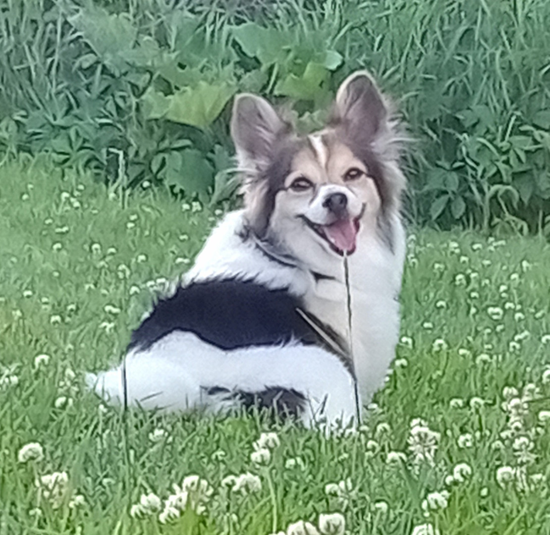 Ide say, she can hear me grabbing the car keys no matter what. She will be standing at the door before i even get my shoes on. Looking up at me super happy its "flying" time. And Her face- her teeth makes her always look like she is sticking out her tounge, her colors