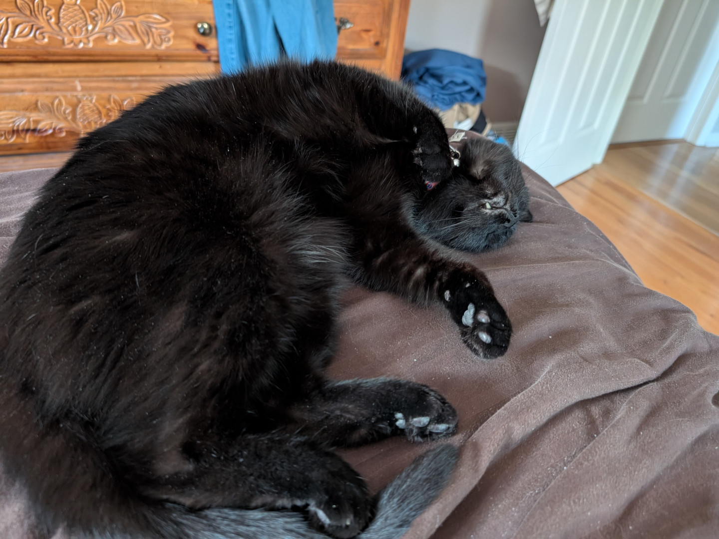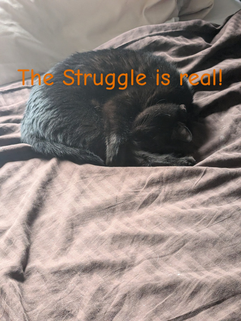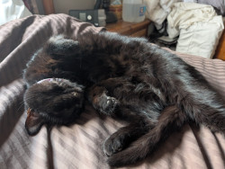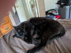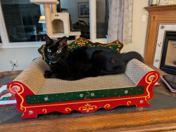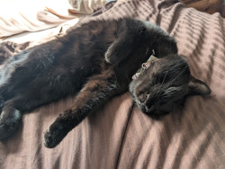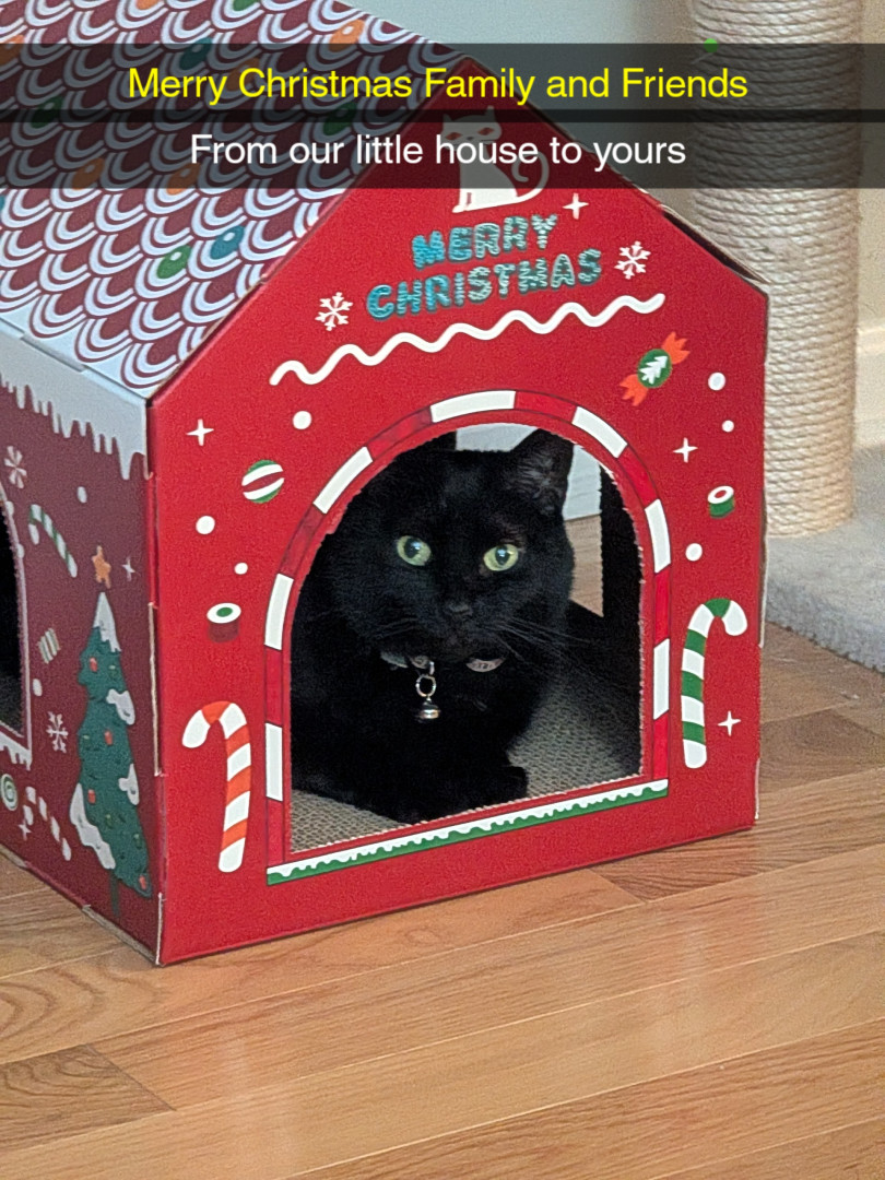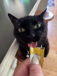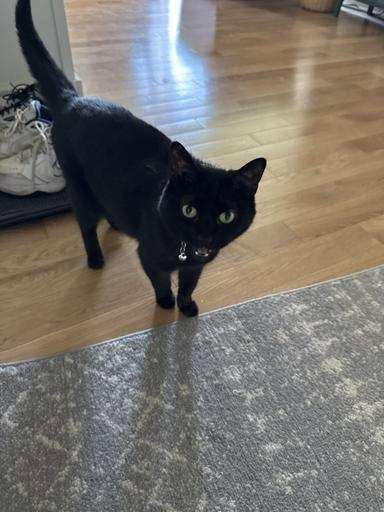 All black, small and fearless, loves to be pampered with back scratches and belly rubs. Follows us like a dog all through the house.