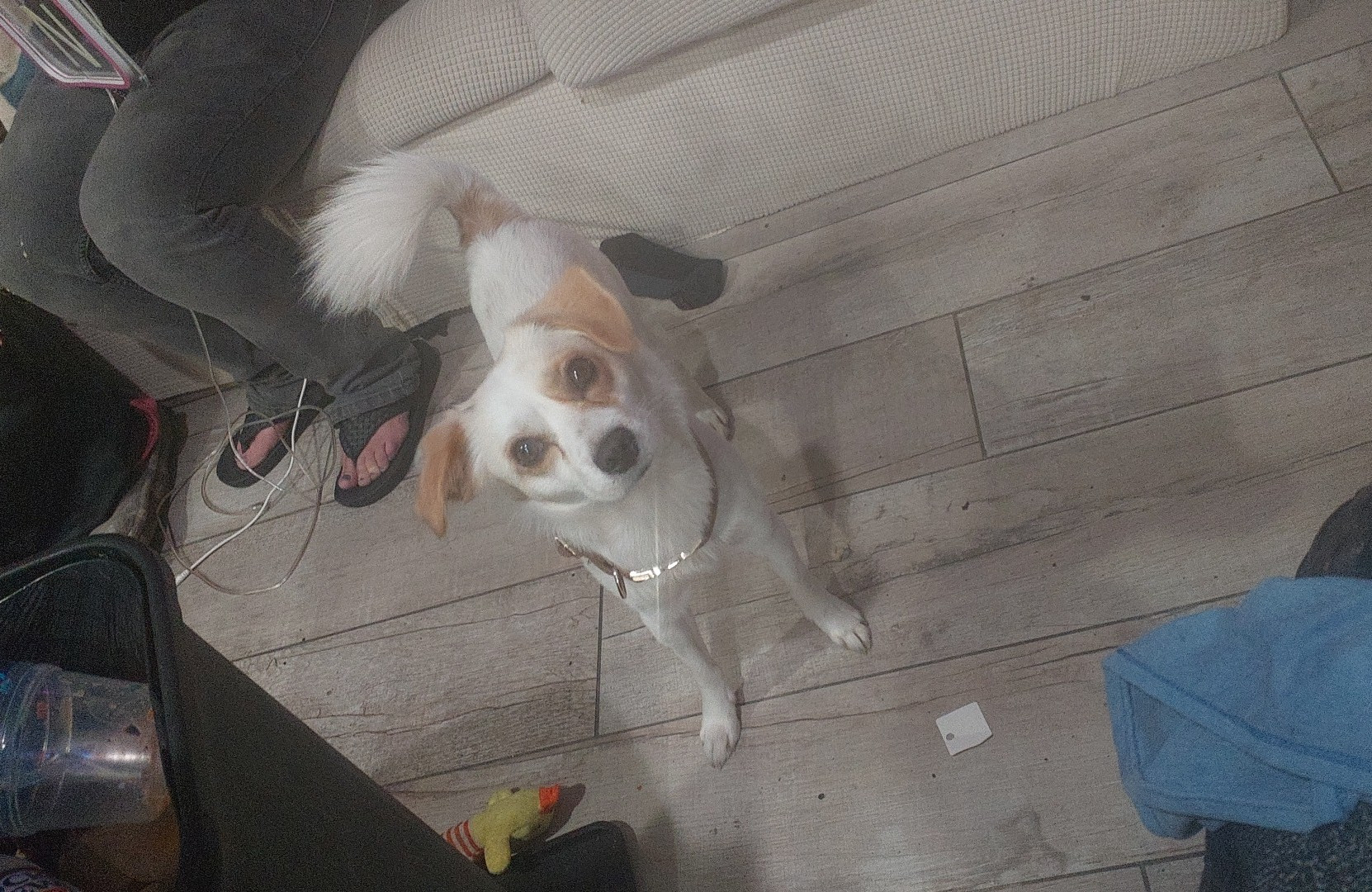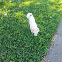 He's a small medium papijack white with brown and brown eyes black nose curled up long haired tail that's always on protection alert lol