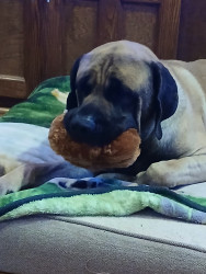Bruce is 3 years old. We adopted him when he was 2. I did not want a big Ole slobbering dog my husband did. It wasn't long before he won my heart. He comes up and puts his head in your lap just wanting to be loved on. You can be gone 15 minutes and when you get back it's like you've been gone a week. He's just so happy to see you. He gets along very well with our chiawaha Cookie. Cookie still rules the roost!!