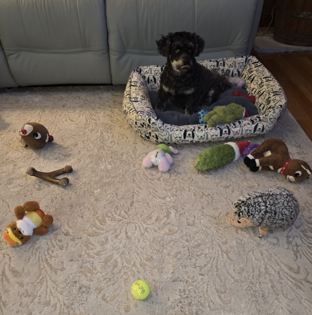 Receive Text UpdatesEvery toy that makes noise. He has plenty. When he starts to chew them all that needs to be said is I know you're not doing that. He stops and looks like not me!