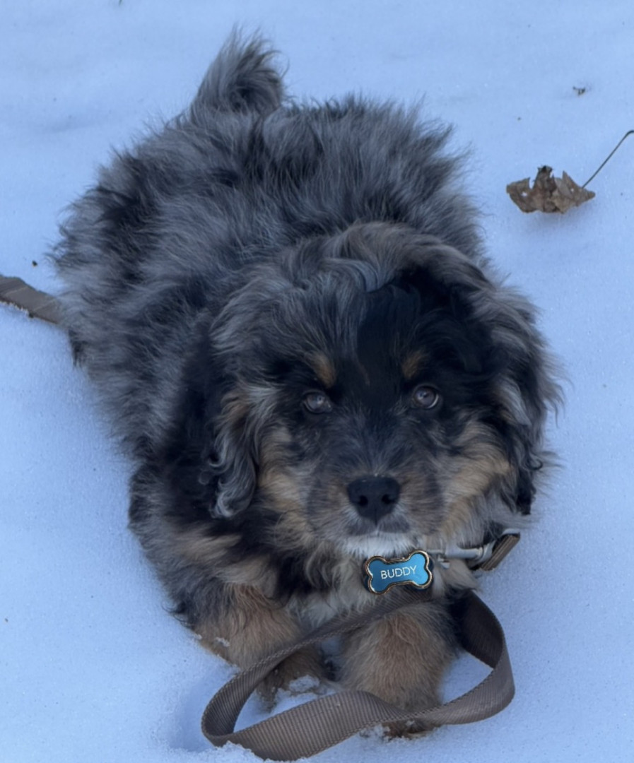 Buddy is obsessed with snow. He will hop and frolic through the snow face first and roll around until he is covered with snow clumps.