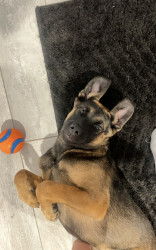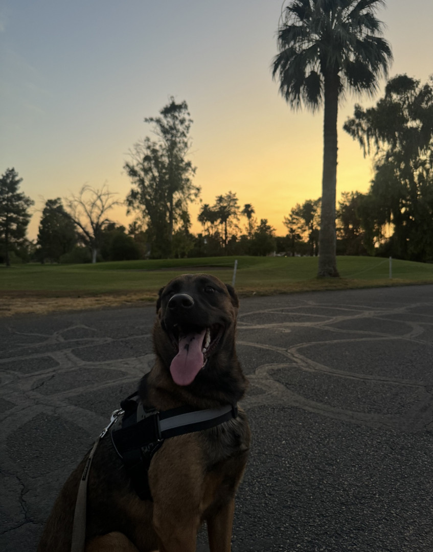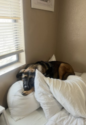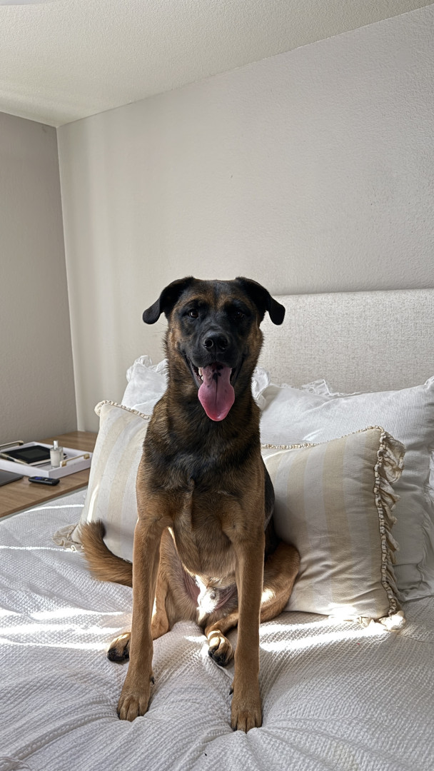 He loves to lay on top of pillows, bed pillows, couch pillows, you name it. He also likes to jump super high on command and walk himself back in after going outside! He always has to grab the leash in his mouth on the way back inside. One of his favorite tricks is “pray,” “wait,” (where he stays until we yell come) or “safety” (where he walks in between our legs and lies down).