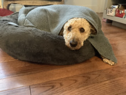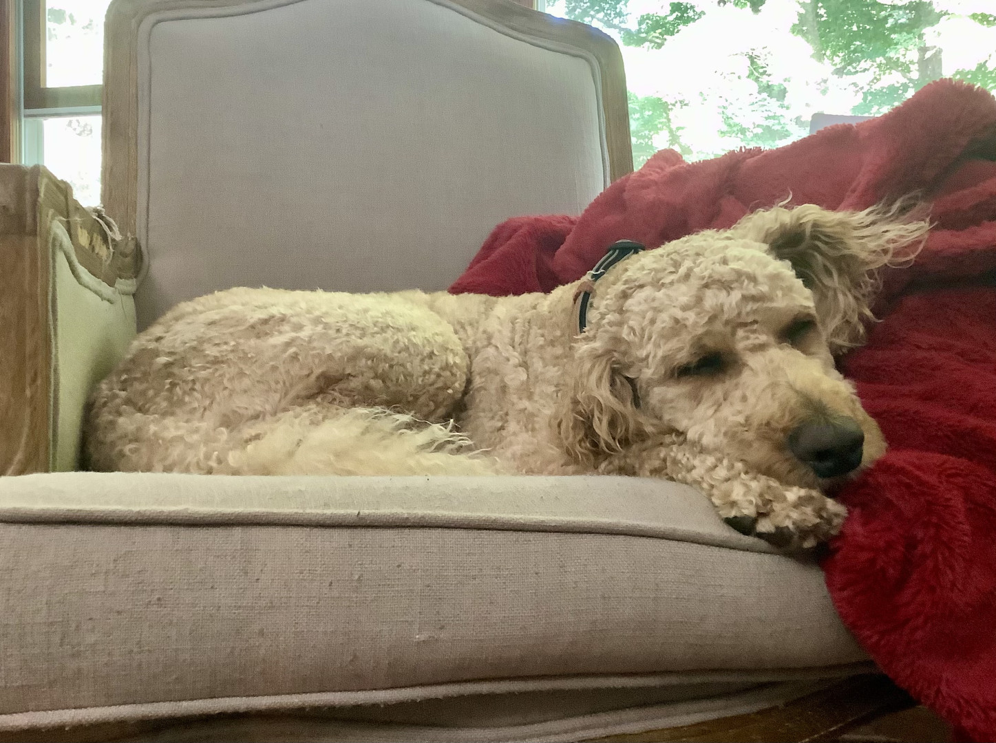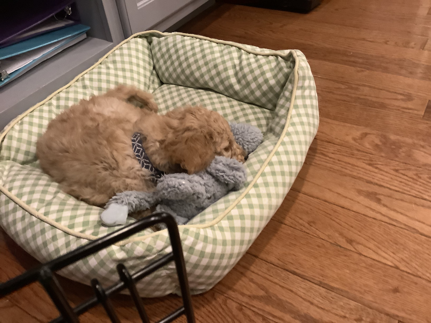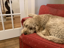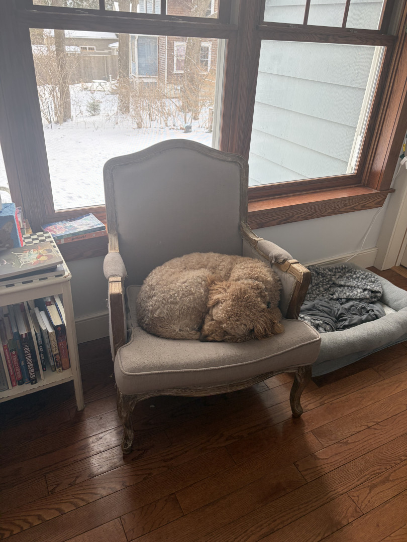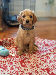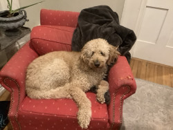 Buddy's a mischievous, energetic Goldendoodle who loves to play the snow, destroy his toys, go on long walks, and cuddle up with his fam