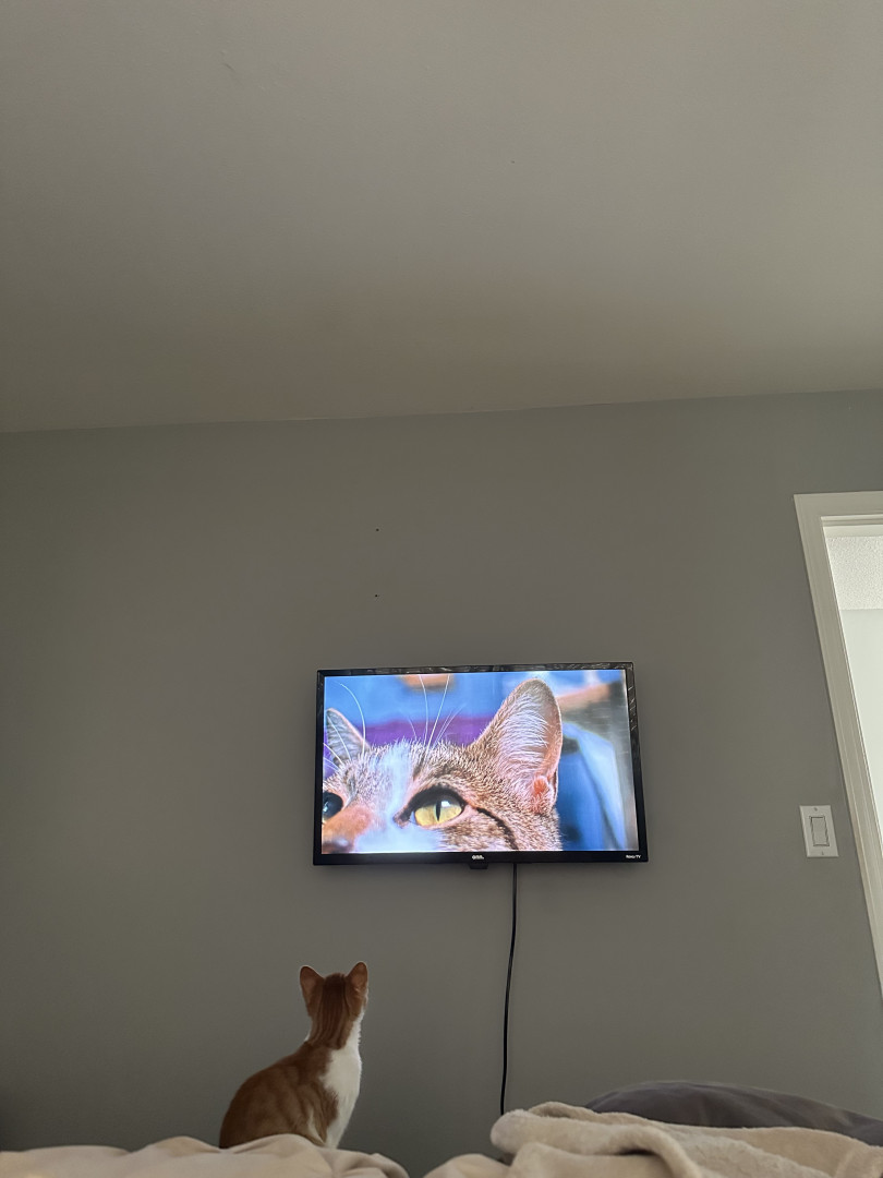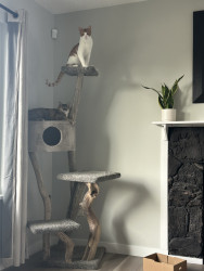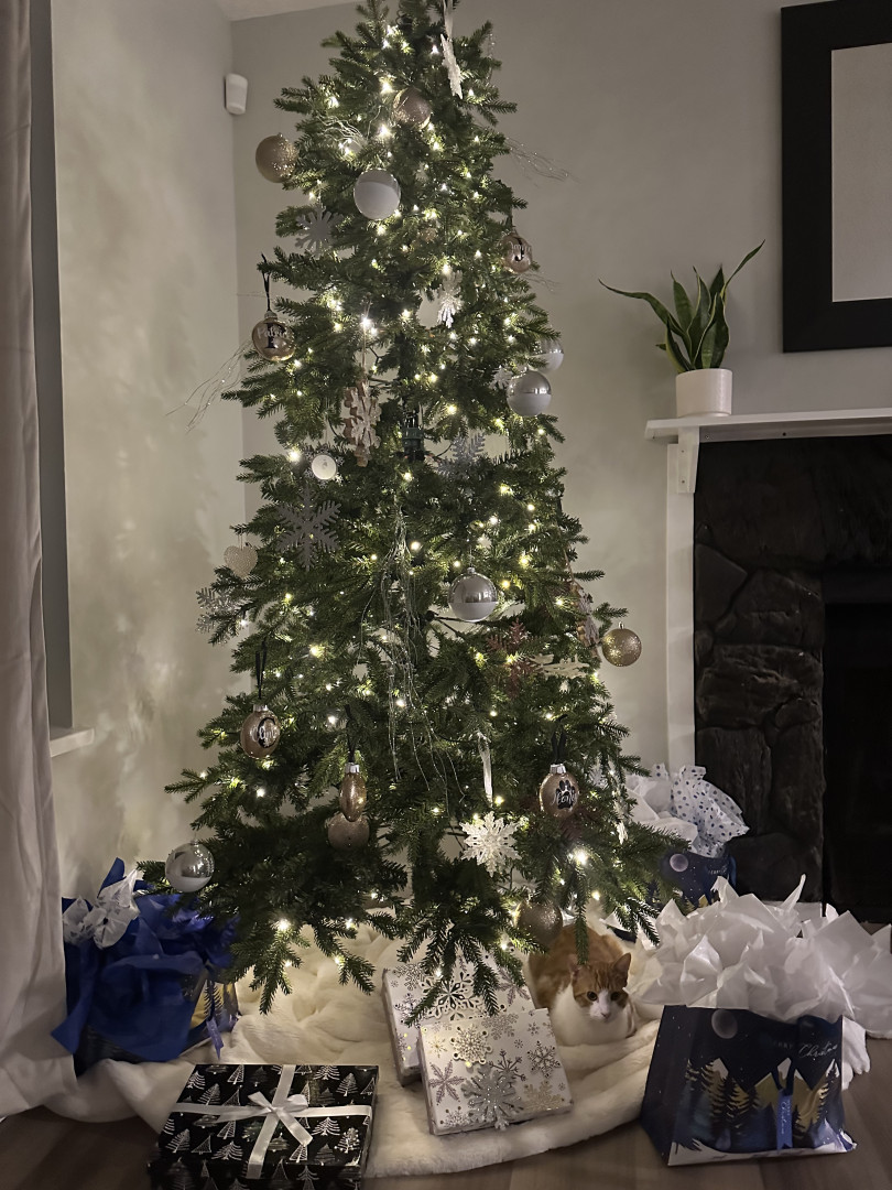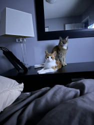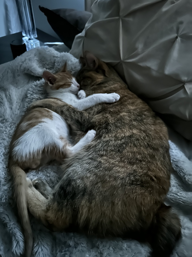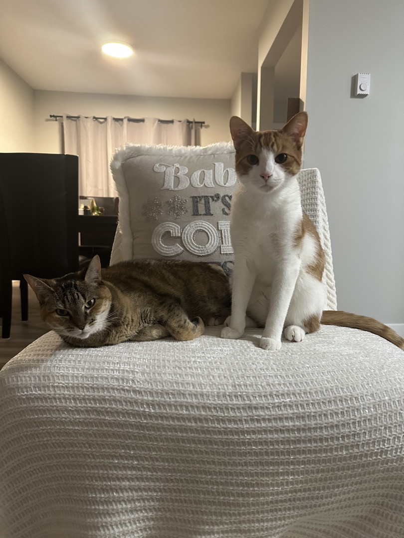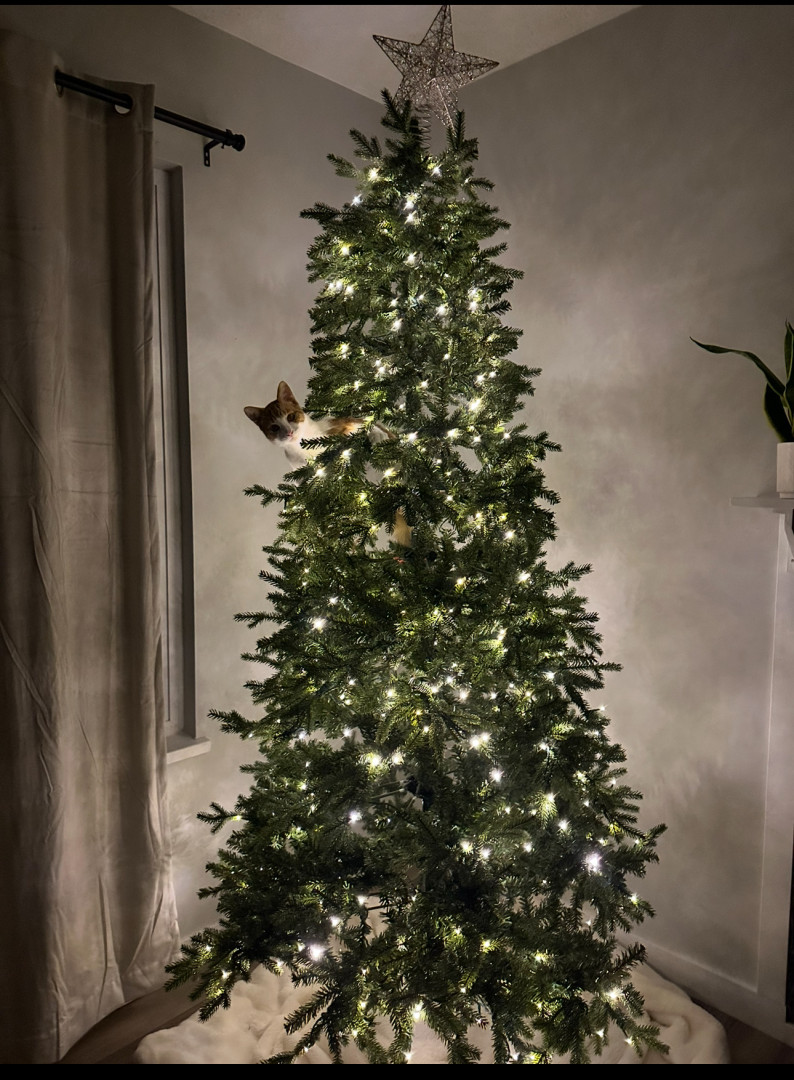 Buddy is so cute when he is sleeping and snuggling but when he wakes up he just looks for trouble ! Avid bird watcher Runs up and down the stairs then down the hall then up his scratching post , & does it all over again . Knocks stuff off the counter Climbs the Christmas tree all December & Loves to just sit in it He makes me Decorate the tree everyday Sees that His sister Honey is quietly sleeping & wants to wake her up.Most unique quality Buds & Honey got matching heart ear tattoos 🖤