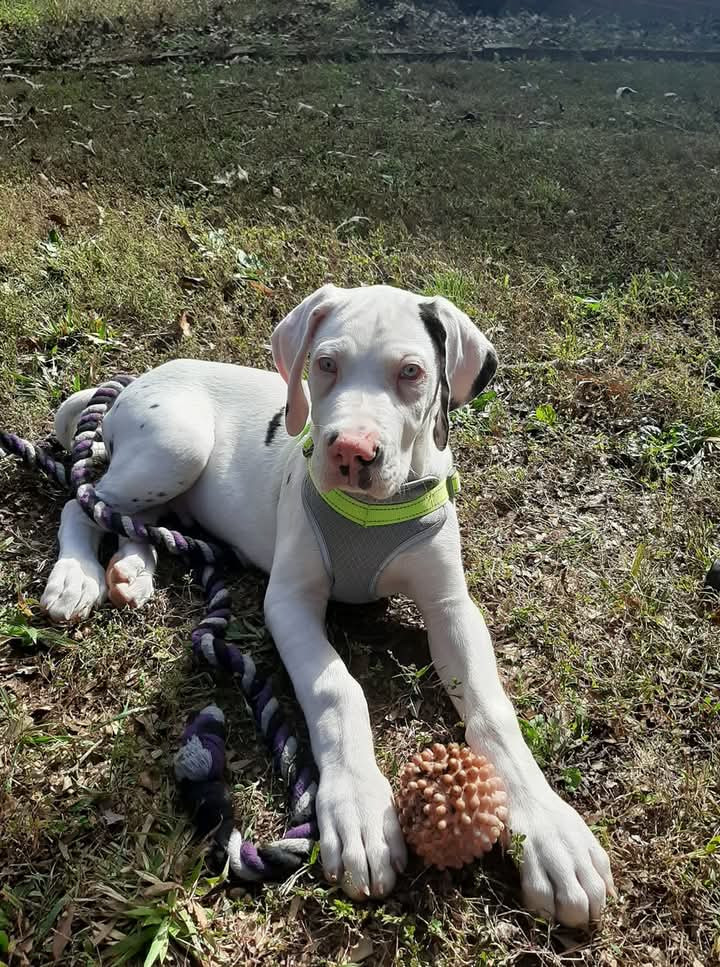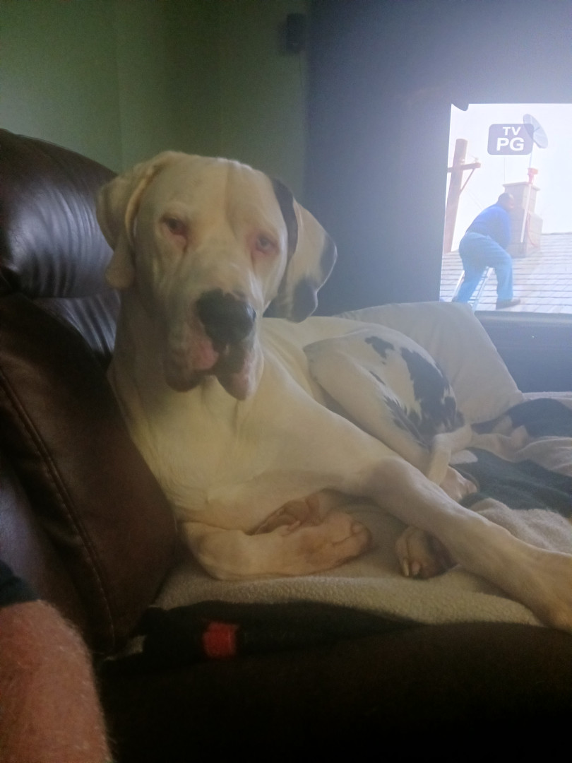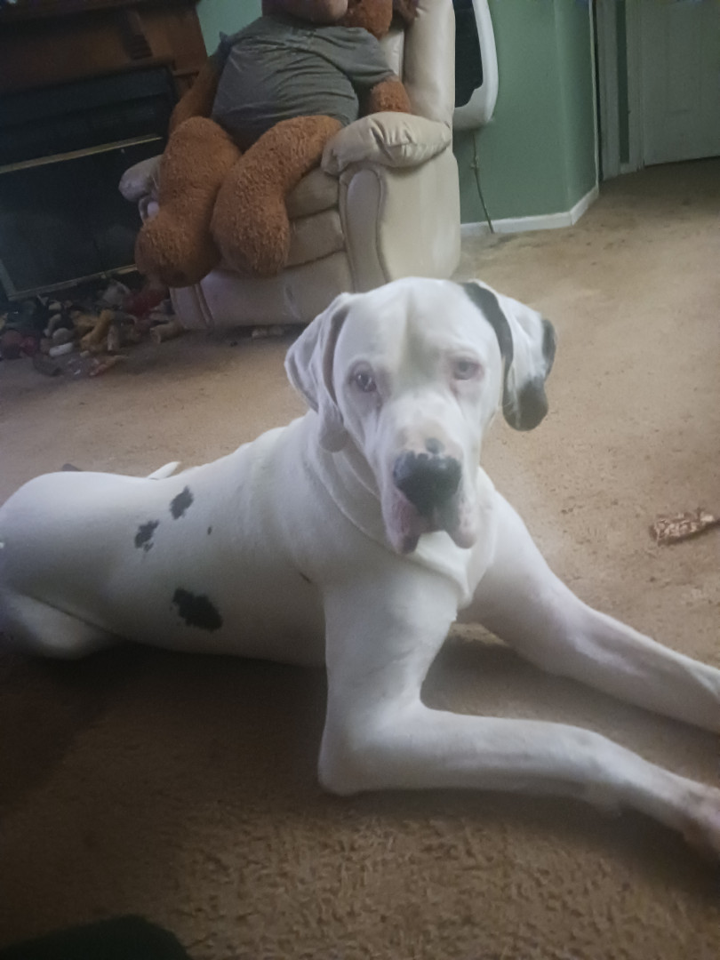 Buddy is 5 year old harlequin great dane with 2 blue eyes and NOT blind or deaf! Full of energy and a big sweetheart! He is my best friend