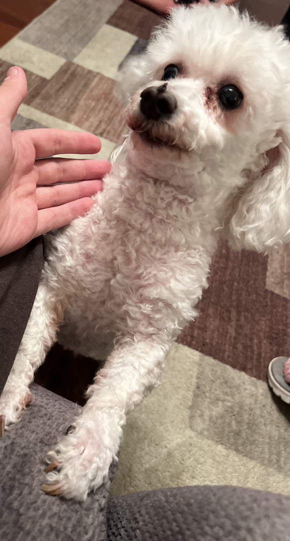 He’s a white toy poodle, he loves cuddles and playing.