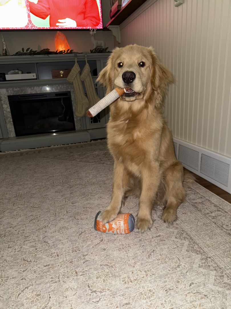 Burner is named after Buffalo NYs favorite beer, Hayburner. The brewery loved his name so much they gave him a toy of the beer he was named after and called it a Haybarker! He’s modeled for the brewery and has received lots of fun toys from it but that is his favorite!