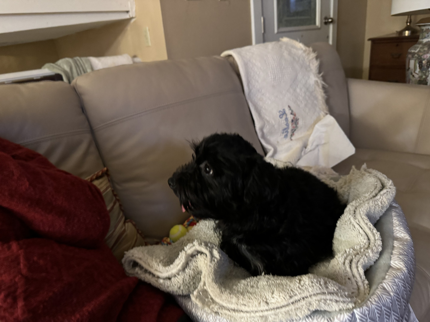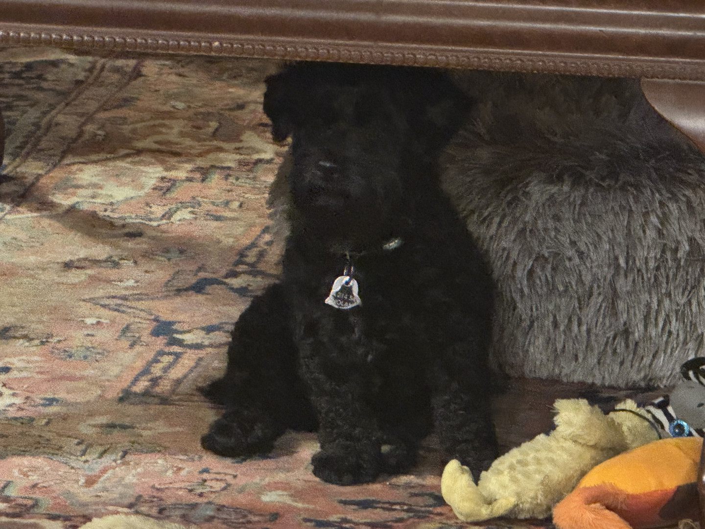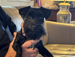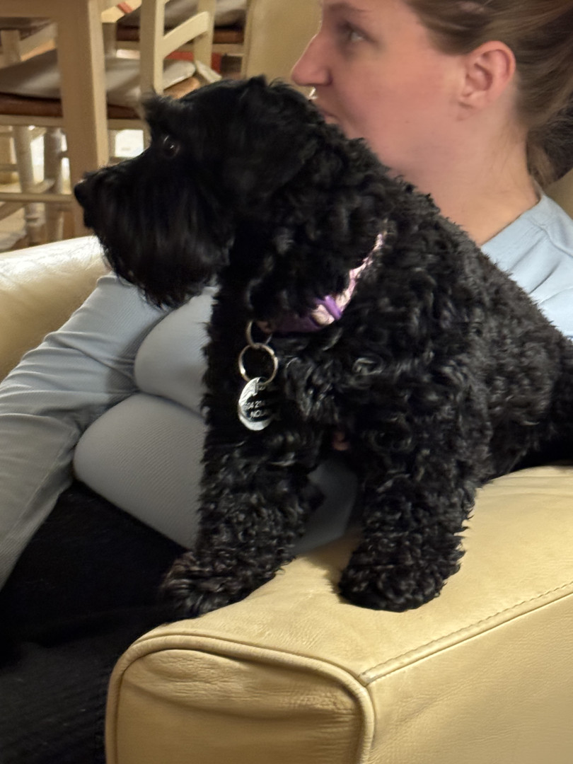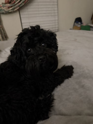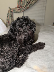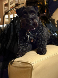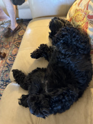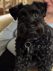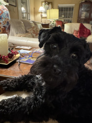 Burreaux is a 2 1/2 year old male mini Schnoodle. He loves to play with his stuffed animal “chicken”, going for as many walks as possible.