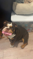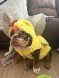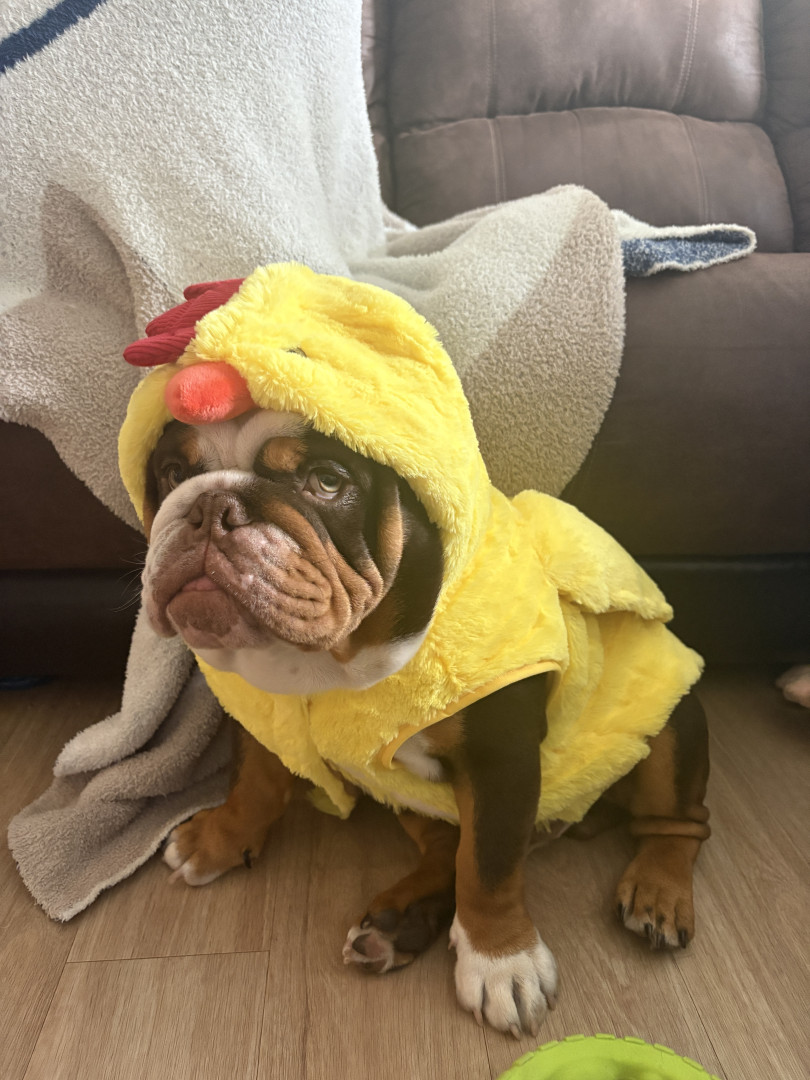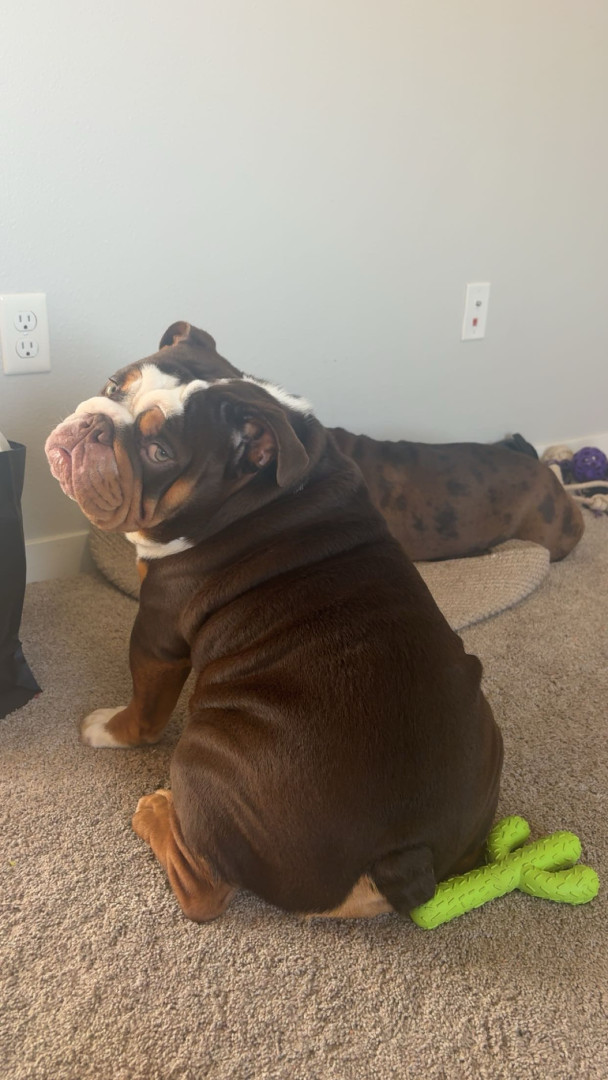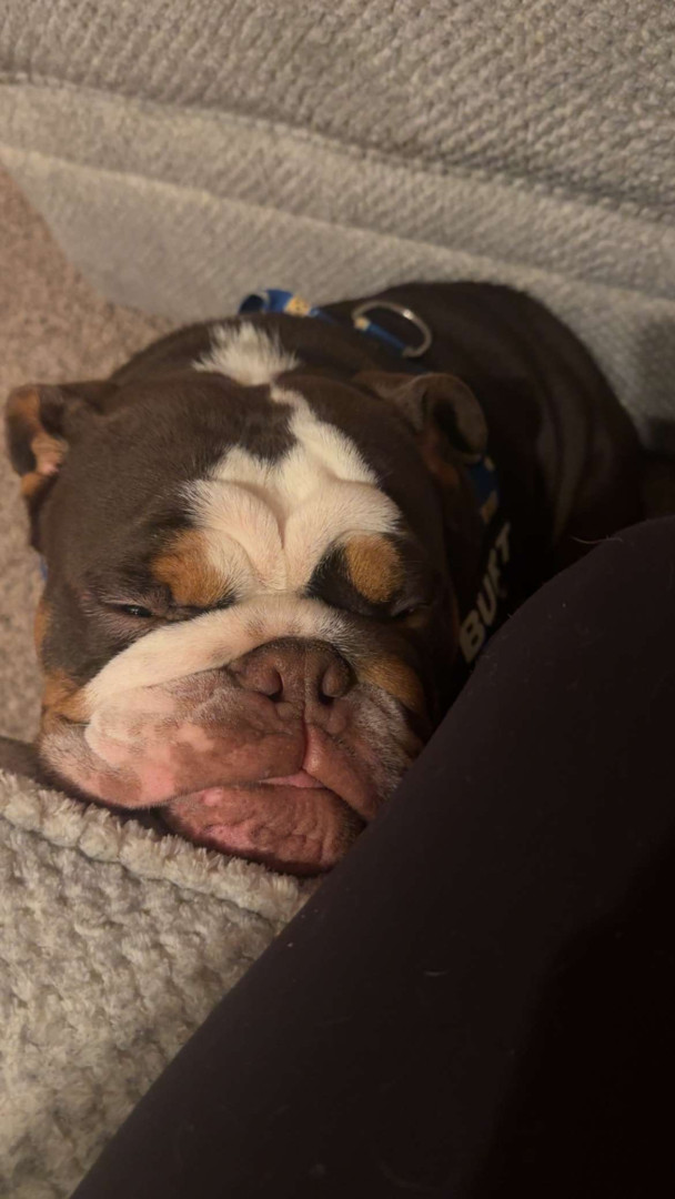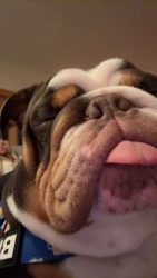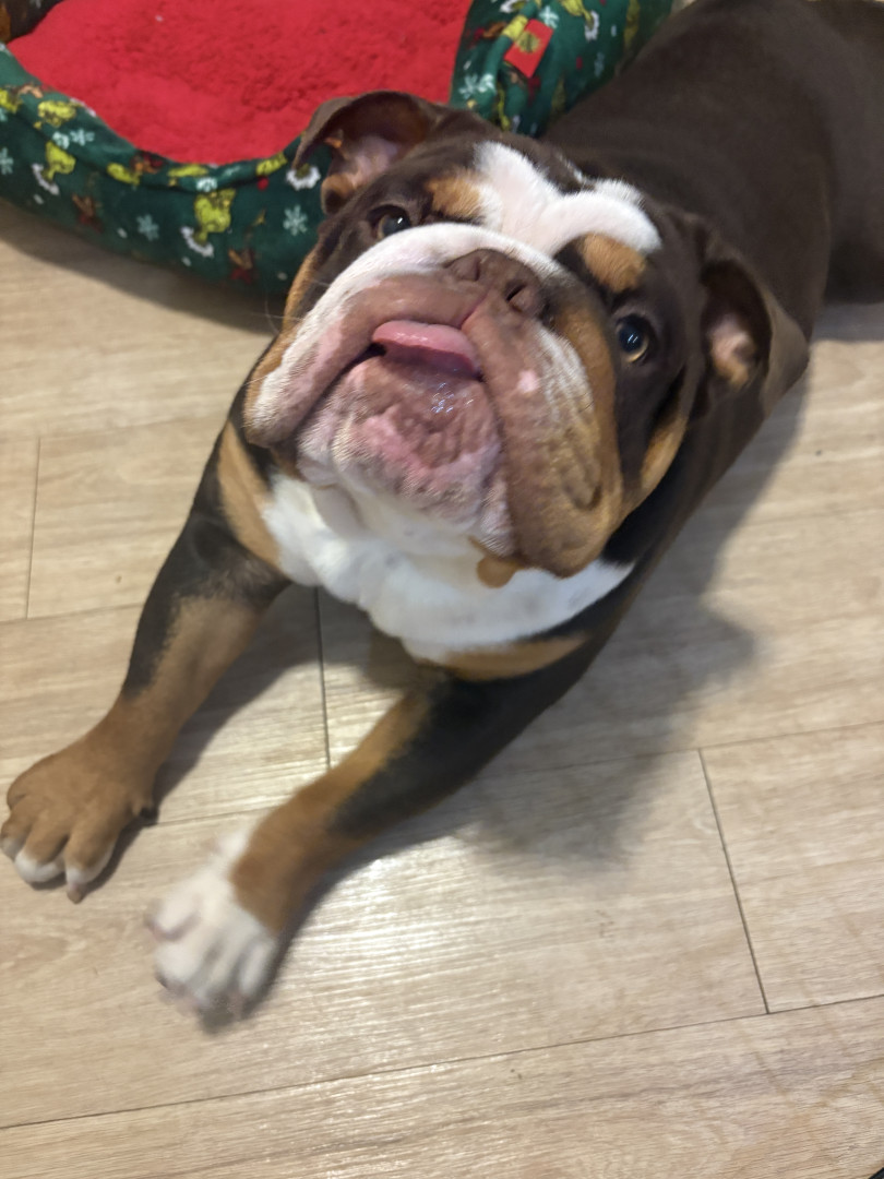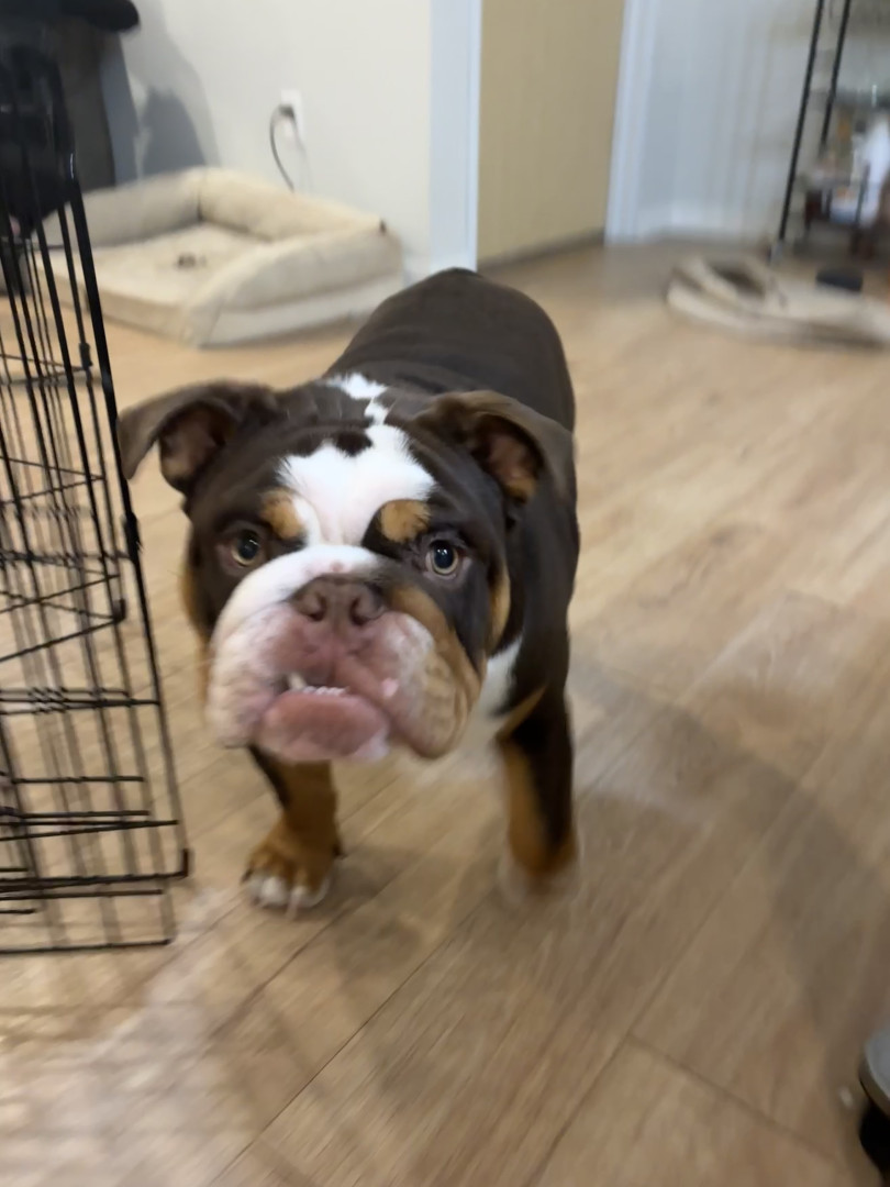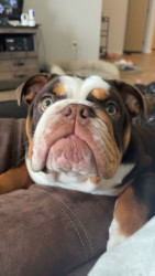 Stubborn, food motivated couch potato until people appear. Then he turns into a sassy diva bulldog demanding attention.