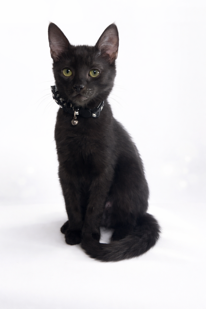 Tiny black domestics short hair cat with bright green eyes—endless energy, nonstop affection, and a velcro cat who never leaves your side.