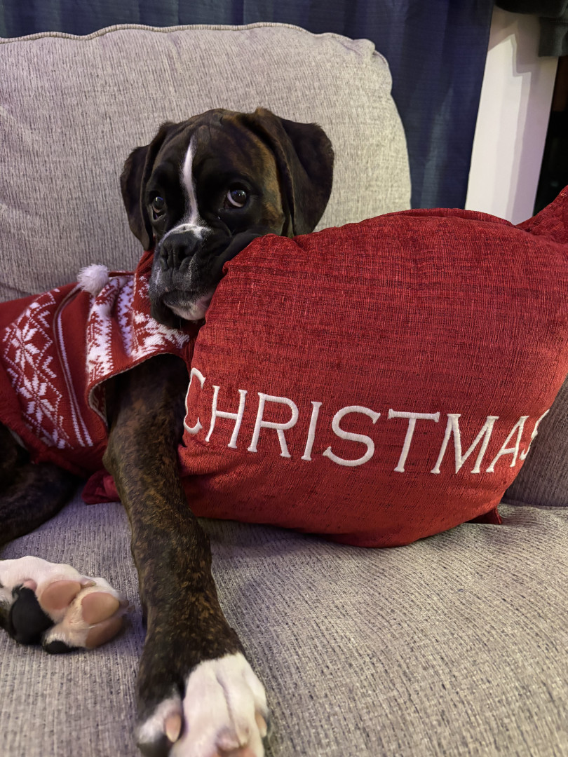 Buster is our 5 month old puppy boxer! This is his first Christmas so we’re getting him in the spirit!