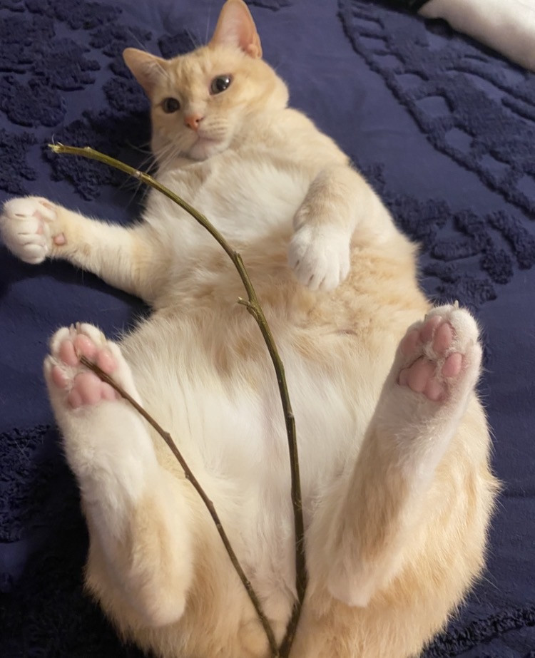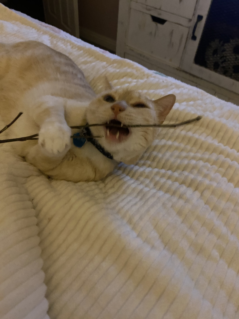 Receive Text UpdatesSurfer’s Delight cat treats! Favorite toy is a real stick from outside!