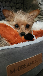 She is super cute and knows it. she is very loving, she thinks she is a large dog and stands her ground, but jumps at any noise. She is just an absolute joy.
