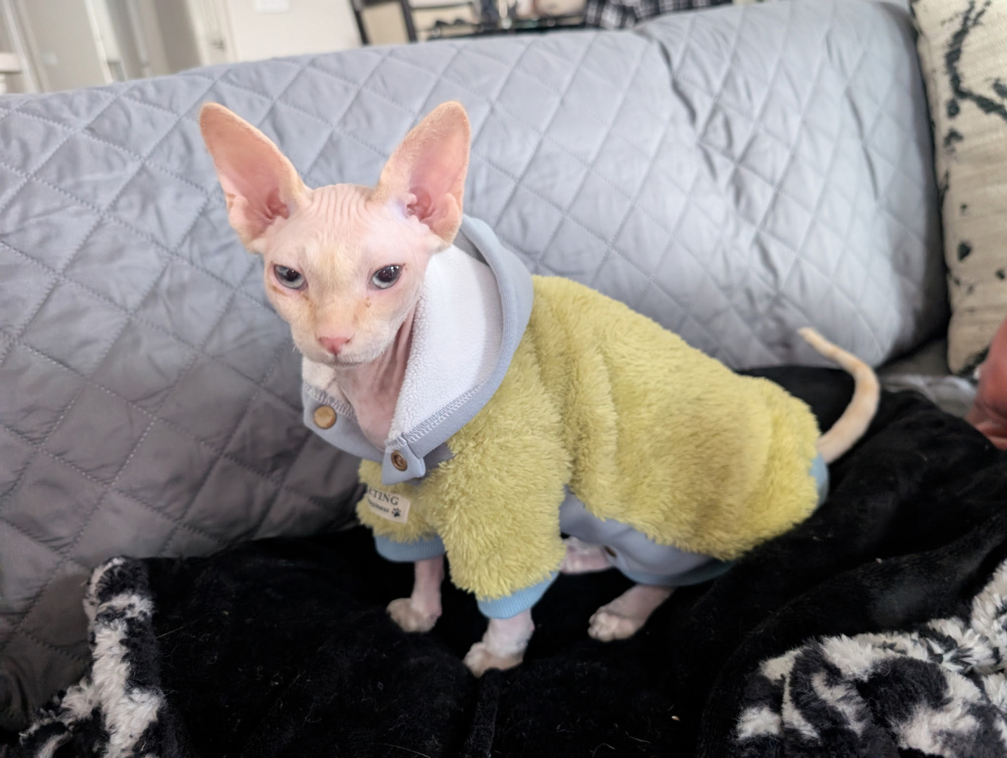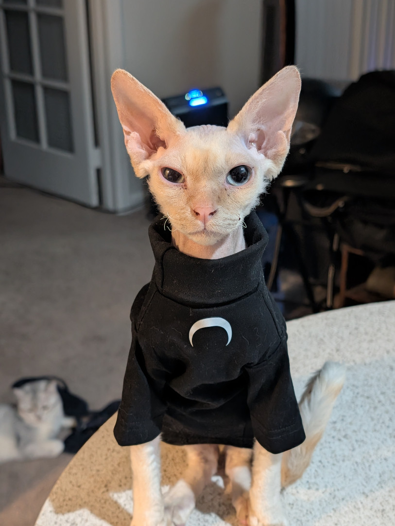 Meet Calvin, the vocal Sphynx shadow who follows Mom & Dad everywhere. He’s a chatty, sweater-wearing style icon with zero personal space!