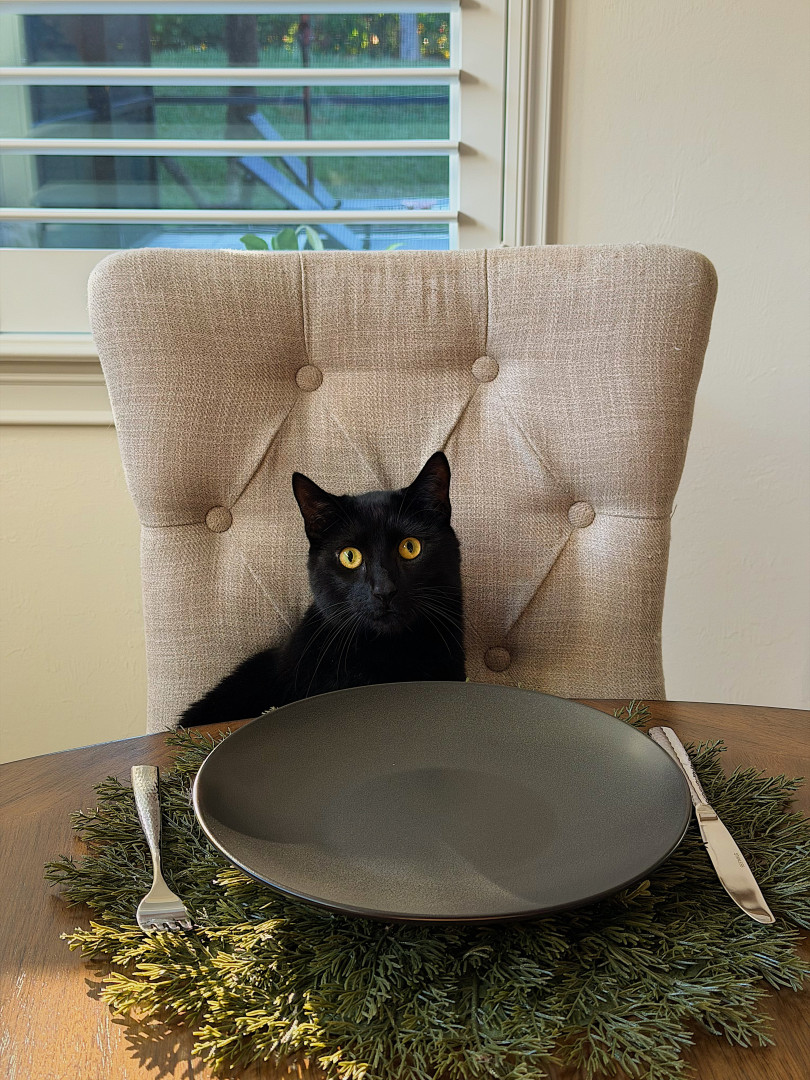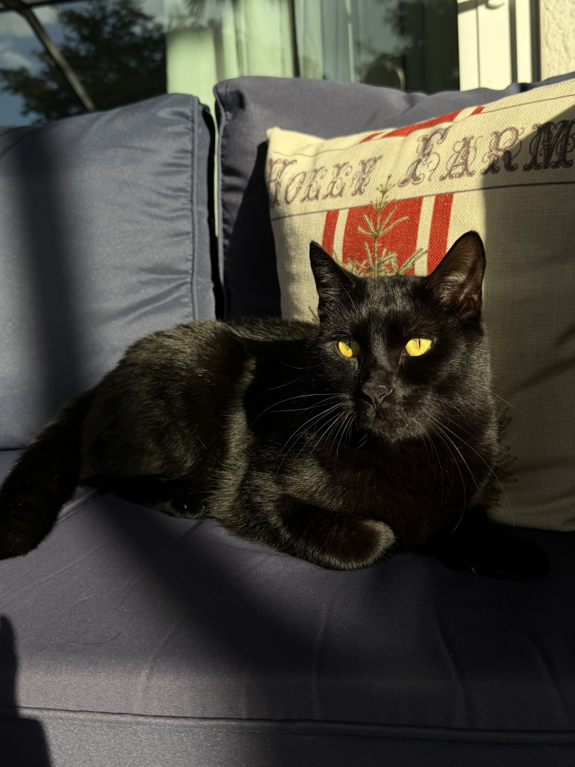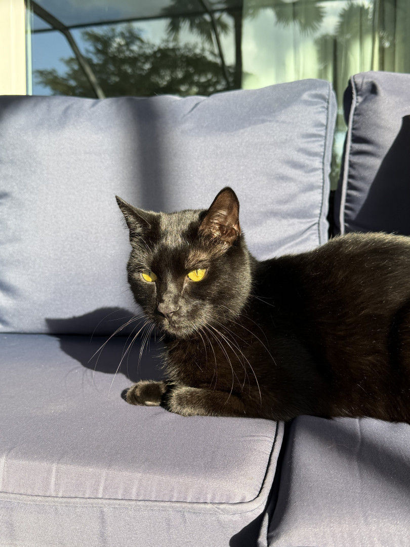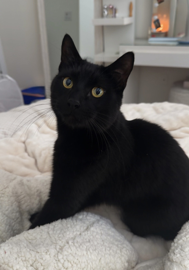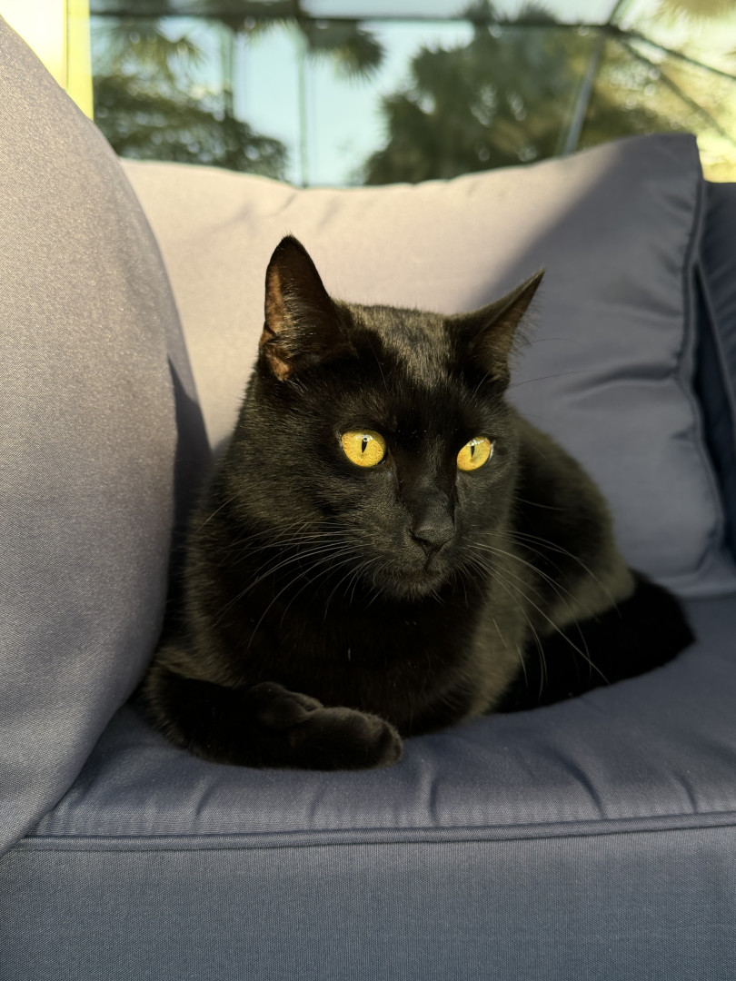 His most unique qualities are his extra toes and his big, round copper eyes. As a Bombay, his completely black fur makes his eyes stand out even more.