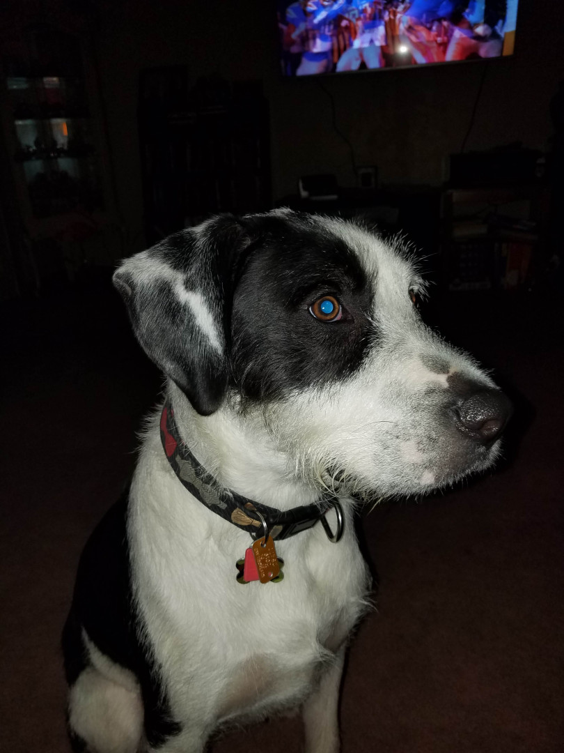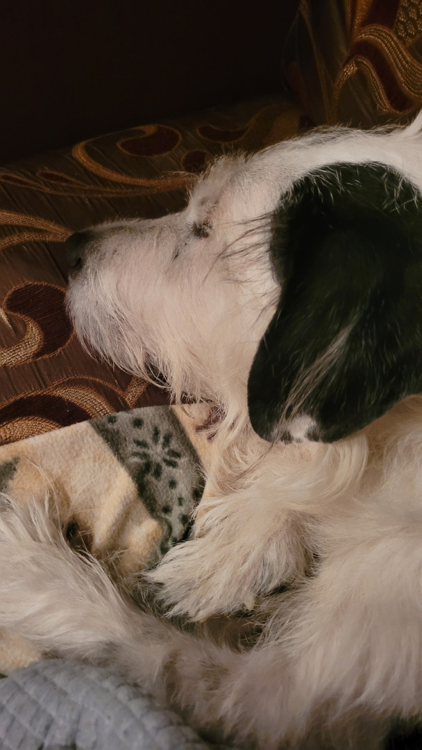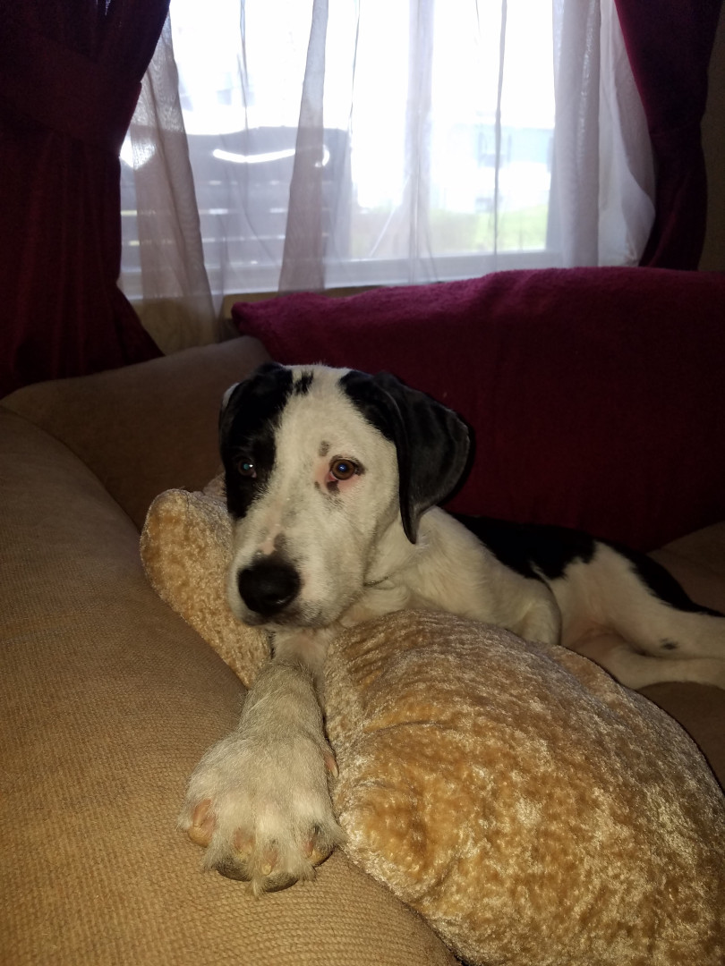 He lays between the living room and the kitchen when we cook dinner
