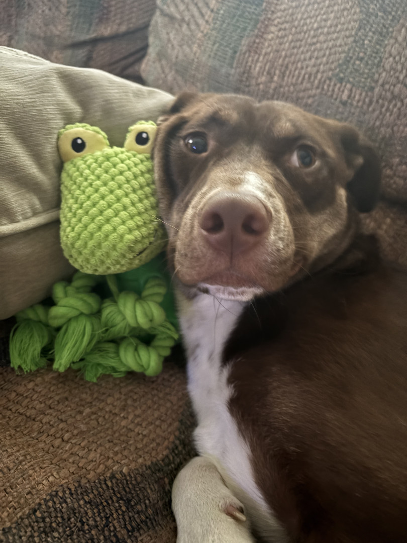 Capone loves his giant pickle toy but nothin can beat his mom’s socks and can mess up a pup cup!