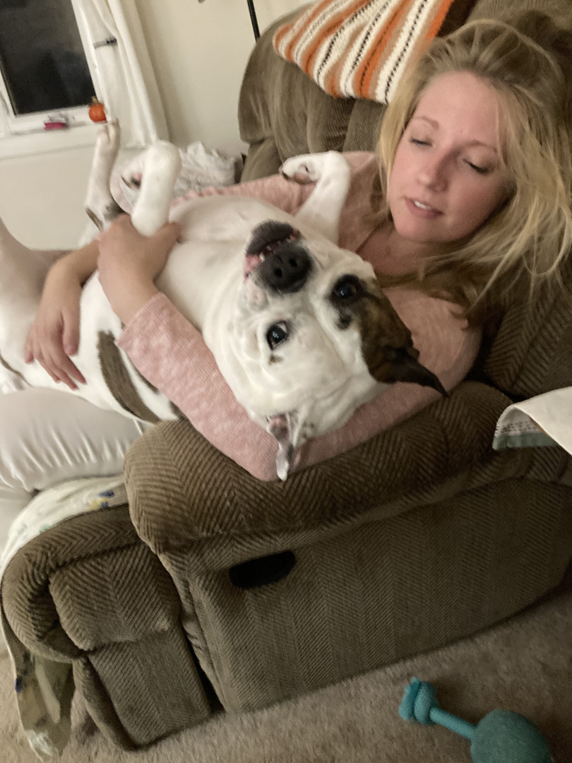 She will at times bark and tries to run when she’s asleep. She likes barking at birds in the trees and also flying overhead in the yard. On the summer, she will pull green beans off the plants and eat them.