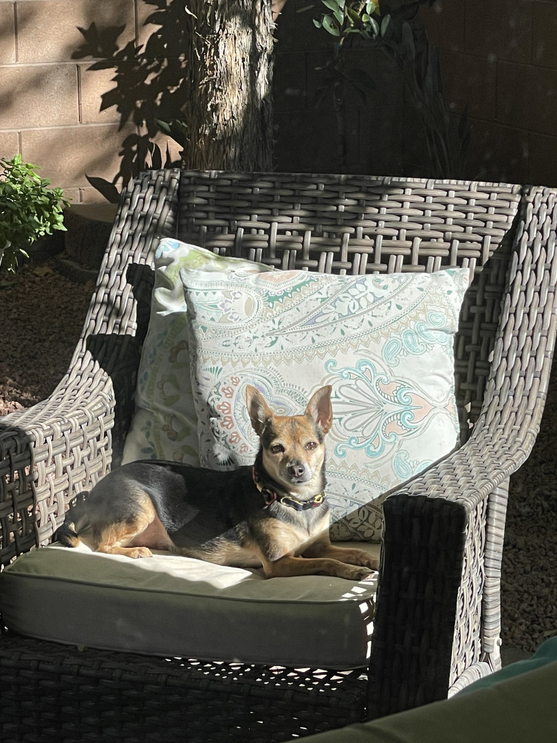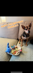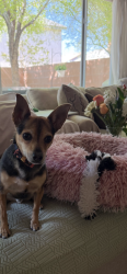 Charley was a 7 pound stray when he joined our family. He runs along our back wall listening for the neighboring dogs! Loves our cat Jade!
