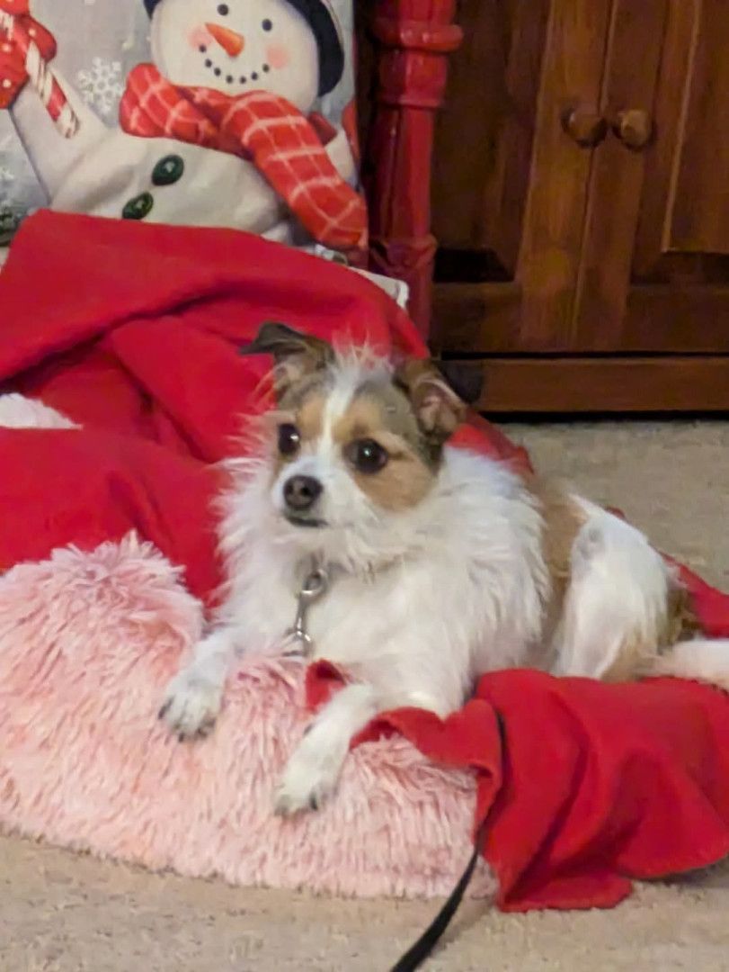 We rescued her 3 yrs ago.She was abandoned pregnant Her puppies were taken and she was left.She melted our heart and rescued us.seniors