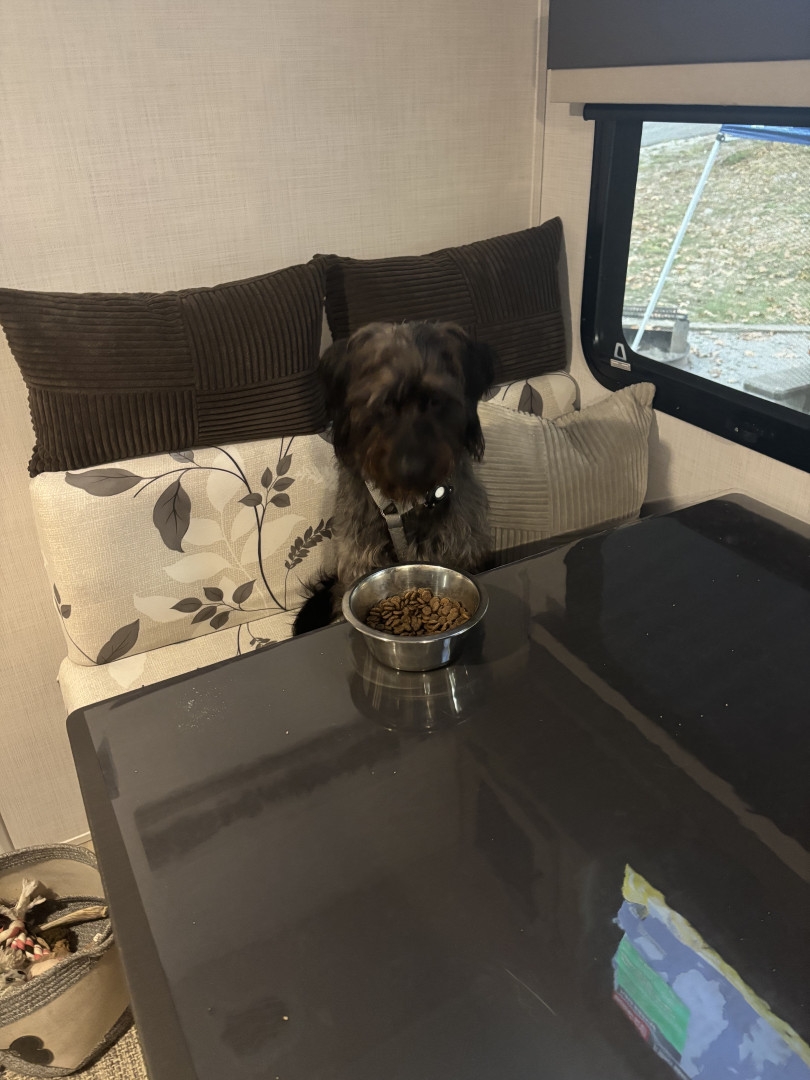 He has a stuffed monkey he likes to go on trips with and likes dehydrated chicken