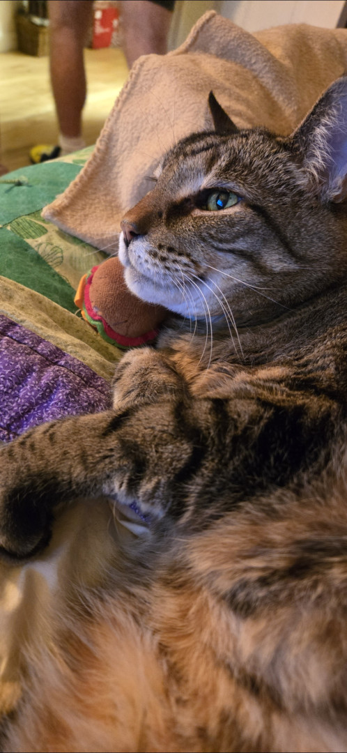 Favorite treat is temptations chicken flavor. Toy is anything with catnip. Charlie loves dairy. He knows when the whip creme bottle comes out. He can here the spraying from a distant.