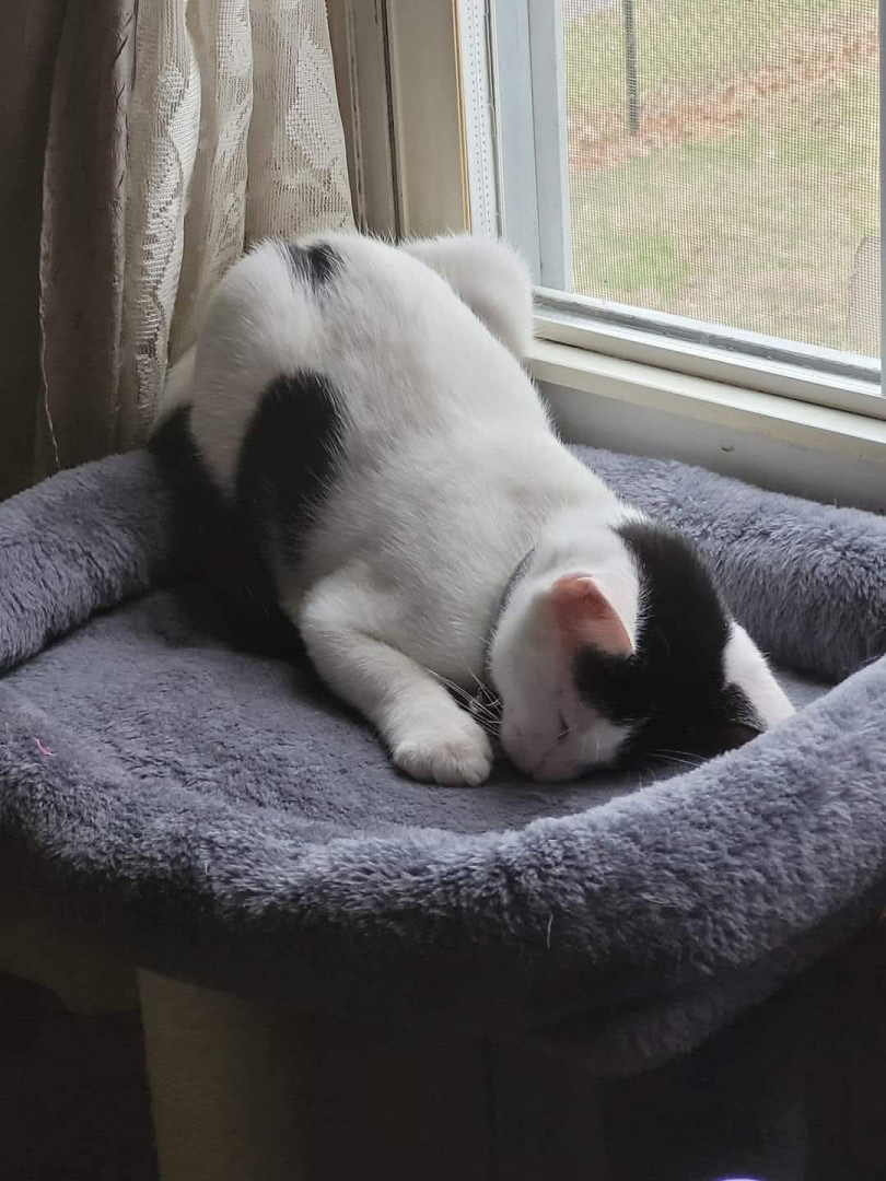 He likes to play with laser toys, and rechargeable balls that zip around the house. He loves Temptations cat nip treats.